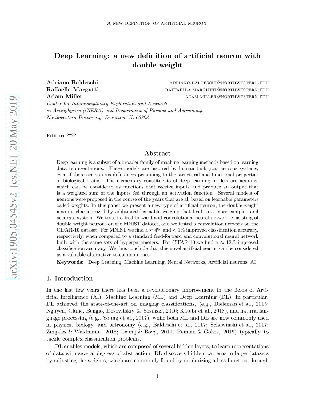 Deep learning is a subset of a broader family of machine learning methods based on learning data representations. These models are inspired by human biological nervous systems, even if there are various differences pertaining to the structural and functional properties of biological brains. The elementary constituents of deep learning models are neurons, which can be considered as functions that receive inputs and produce an output that is a weighted sum of the inputs fed through an activation function. Several models of neurons were proposed in the course of the years that are all based on learnable parameters called weights. In this paper we present a new type of artificial neuron, the double-weight neuron,characterized by additional learnable weights that lead to a more complex and accurate system. We tested a feed-forward and convolutional neural network consisting of double-weight neurons on the MNIST dataset, and we tested a convolution network on the CIFAR-10 dataset. For MNIST we find a and improved classification accuracy, respectively, when compared to a standard feed-forward and convolutional neural network built with the same sets of hyperparameters. For CIFAR-10 we find a improved classification accuracy. We thus conclude that this novel artificial neuron can be considered as a valuable alternative to common ones.
