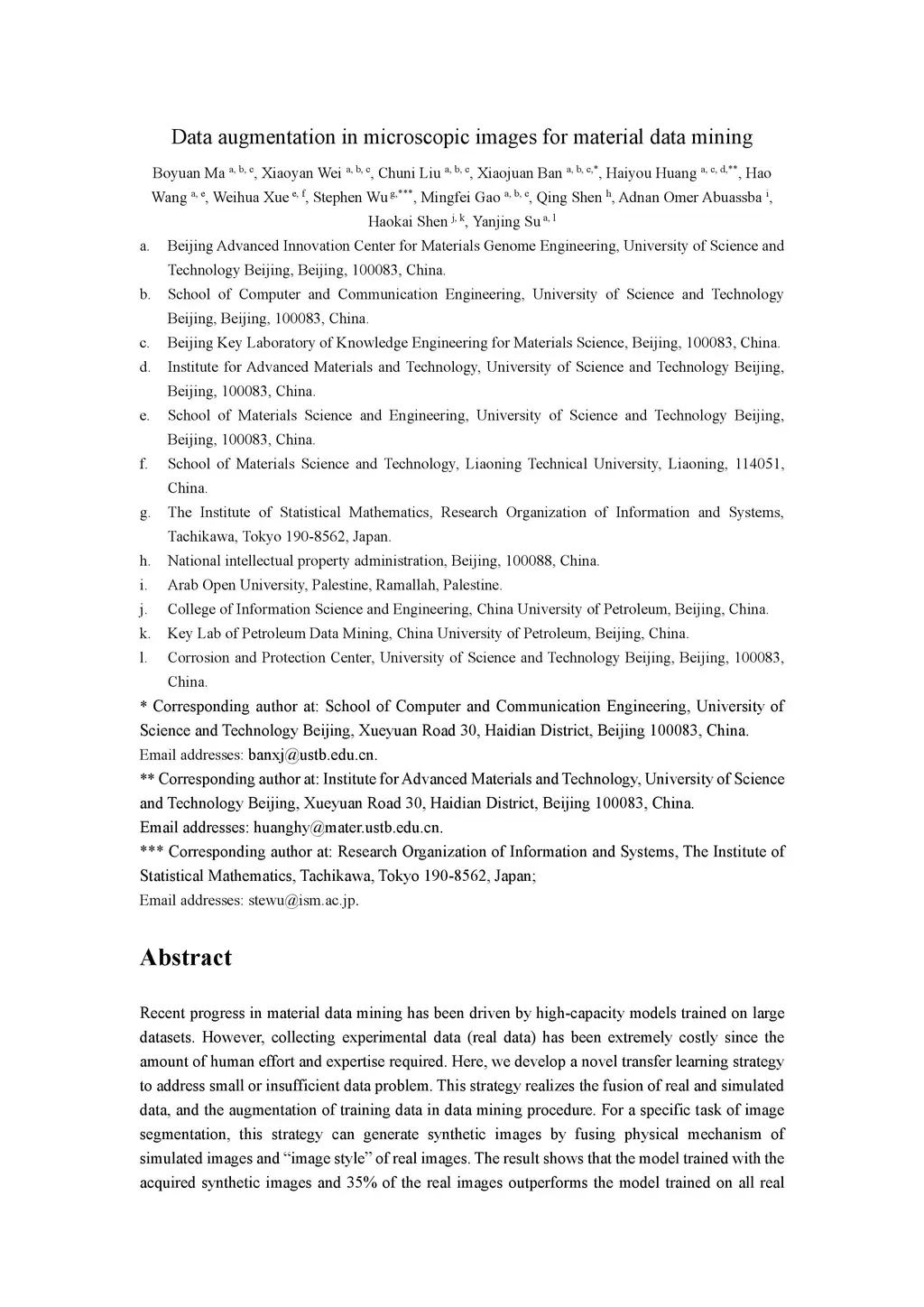 Recent progress in material data mining has been driven by high-capacity models trained on large datasets. However, collecting experimental data (real data) has been extremely costly since the amount of human effort and expertise required. Here, we develop a novel transfer learning strategy to address small or insufficient data problem. This strategy realizes the fusion of real and simulated data, and the augmentation of training data in data mining procedure. For a specific task of image segmentation, this strategy can generate synthetic images by fusing physical mechanism of simulated images and "image style" of real images. The result shows that the model trained with the acquired synthetic images and 35% of the real images outperforms the model trained on all real images. As the time required to generate synthetic data is almost negligible, this strategy is able to reduce the time cost of real data preparation by roughly 65%.
