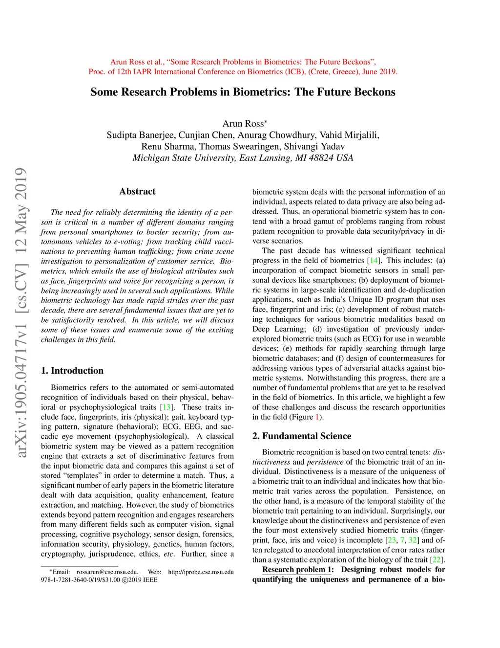 The need for reliably determining the identity of a person is critical in a number of different domains ranging from personal smartphones to border security; from autonomous vehicles to e-voting; from tracking child vaccinations to preventing human trafficking; from crime scene investigation to personalization of customer service. Biometrics, which entails the use of biological attributes such as face, fingerprints and voice for recognizing a person, is being increasingly used in several such applications. While biometric technology has made rapid strides over the past decade, there are several fundamental issues that are yet to be satisfactorily resolved. In this article, we will discuss some of these issues and enumerate some of the exciting challenges in this field.