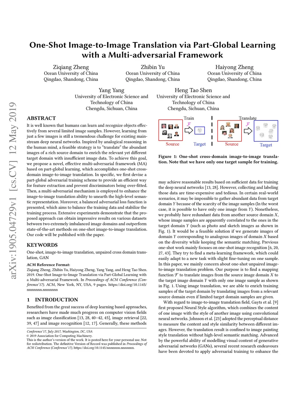 One-Shot Image-to-Image Translation via Part-Global Learning with a