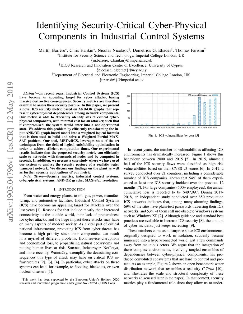 In recent years, Industrial Control Systems (ICS) have become an appealing target for cyber attacks, having massive destructive consequences. Security metrics are therefore essential to assess their security posture. In this paper, we present a novel ICS security metric based on AND/OR graphs that represent cyber-physical dependencies among network components. Our metric is able to efficiently identify sets of critical cyber-physical components, with minimal cost for an attacker, such that if compromised, the system would enter into a non-operational state. We address this problem by efficiently transforming the input AND/OR graph-based model into a weighted logical formula that is then used to build and solve a Weighted Partial MAX-SAT problem. Our tool, META4ICS, leverages state-of-the-art techniques from the field of logical satisfiability optimisation in order to achieve efficient computation times. Our experimental results indicate that the proposed security metric can efficiently scale to networks with thousands of nodes and be computed in seconds. In addition, we present a case study where we have used our system to analyse the security posture of a realistic water transport network. We discuss our findings on the plant as well as further security applications of our metric.