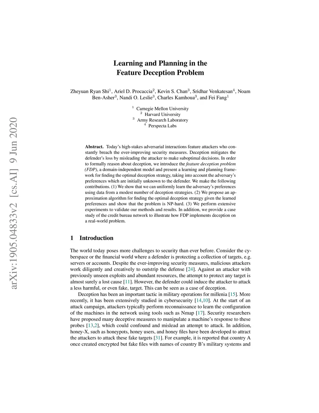 Today's high-stakes adversarial interactions feature attackers who constantly breach the ever-improving security measures. Deception mitigates the defender's loss by misleading the attacker to make suboptimal decisions. In order to formally reason about deception, we introduce the feature deception problem (FDP), a domain-independent model and present a learning and planning framework for finding the optimal deception strategy, taking into account the adversary's preferences which are initially unknown to the defender. We make the following contributions. (1) We show that we can uniformly learn the adversary's preferences using data from a modest number of deception strategies. (2) We propose an approximation algorithm for finding the optimal deception strategy given the learned preferences and show that the problem is NP-hard. (3) We perform extensive experiments to validate our methods and results. In addition, we provide a case study of the credit bureau network to illustrate how FDP implements deception on a real-world problem.
