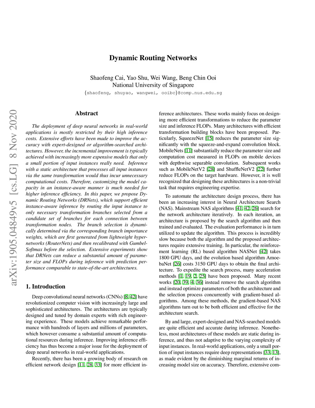 The deployment of deep neural networks in real-world applications is mostly restricted by their high inference costs. Extensive efforts have been made to improve the accuracy with expert-designed or algorithm-searched architectures. However, the incremental improvement is typically achieved with increasingly more expensive models that only a small portion of input instances really need. Inference with a static architecture that processes all input instances via the same transformation would thus incur unnecessary computational costs. Therefore, customizing the model capacity in an instance-aware manner is much needed for higher inference efficiency. In this paper, we propose Dynamic Routing Networks (DRNets), which support efficient instance-aware inference by routing the input instance to only necessary transformation branches selected from a candidate set of branches for each connection between transformation nodes. The branch selection is dynamically determined via the corresponding branch importance weights, which are first generated from lightweight hypernetworks (RouterNets) and then recalibrated with Gumbel-Softmax before the selection. Extensive experiments show that DRNets can reduce a substantial amount of parameter size and FLOPs during inference with prediction performance comparable to state-of-the-art architectures.