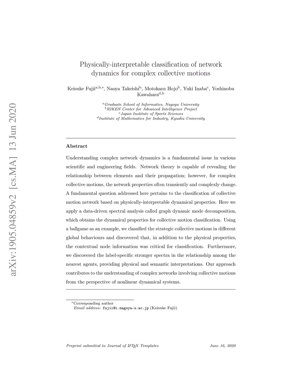 Understanding biological network dynamics is a fundamental issue in various scientific and engineering fields. Network theory is capable of revealing the relationship between elements and their propagation; however, for complex collective motions, the network properties often transiently and complexly change. A fundamental question addressed here pertains to the classification of collective motion network based on physically-interpretable dynamical properties. Here we apply a data-driven spectral analysis called graph dynamic mode decomposition, which obtains the dynamical properties for collective motion classification. Using a ballgame as an example, we classified the strategic collective motions in different global behaviours and discovered that, in addition to the physical properties, the contextual node information was critical for classification. Furthermore, we discovered the label-specific stronger spectra in the relationship among the nearest agents, providing physical and semantic interpretations. Our approach contributes to the understanding of principles of biological complex network dynamics from the perspective of nonlinear dynamical systems.