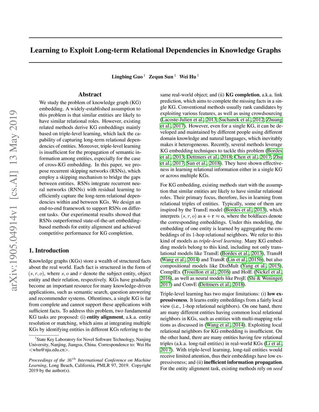 We study the problem of knowledge graph (KG) embedding. A widely-established assumption to this problem is that similar entities are likely to have similar relational roles. However, existing related methods derive KG embeddings mainly based on triple-level learning, which lack the capability of capturing long-term relational dependencies of entities. Moreover, triple-level learning is insufficient for the propagation of semantic information among entities, especially for the case of cross-KG embedding. In this paper, we propose recurrent skipping networks (RSNs), which employ a skipping mechanism to bridge the gaps between entities. RSNs integrate recurrent neural networks (RNNs) with residual learning to efficiently capture the long-term relational dependencies within and between KGs. We design an end-to-end framework to support RSNs on different tasks. Our experimental results showed that RSNs outperformed state-of-the-art embedding-based methods for entity alignment and achieved competitive performance for KG completion.
