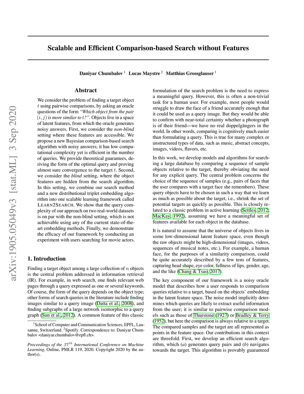 We consider the problem of finding a target object using pairwise comparisons, by asking an oracle questions of the form \emph{"Which object from the pair is more similar to ?"}. Objects live in a space of latent features, from which the oracle generates noisy answers. First, we consider the {\em non-blind} setting where these features are accessible. We propose a new Bayesian comparison-based search algorithm with noisy answers; it has low computational complexity yet is efficient in the number of queries. We provide theoretical guarantees, deriving the form of the optimal query and proving almost sure convergence to the target . Second, we consider the \emph{blind} setting, where the object features are hidden from the search algorithm. In this setting, we combine our search method and a new distributional triplet embedding algorithm into one scalable learning framework called \textsc{Learn2Search}. We show that the query complexity of our approach on two real-world datasets is on par with the non-blind setting, which is not achievable using any of the current state-of-the-art embedding methods. Finally, we demonstrate the efficacy of our framework by conducting an experiment with users searching for movie actors.