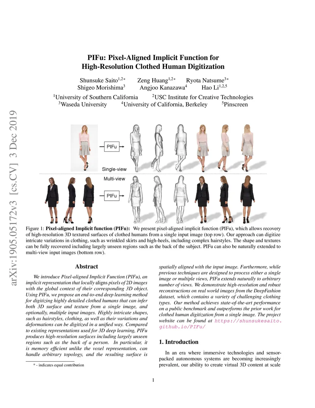 PIFu: Pixel-Aligned Implicit Function for High-Resolution Clothed Human