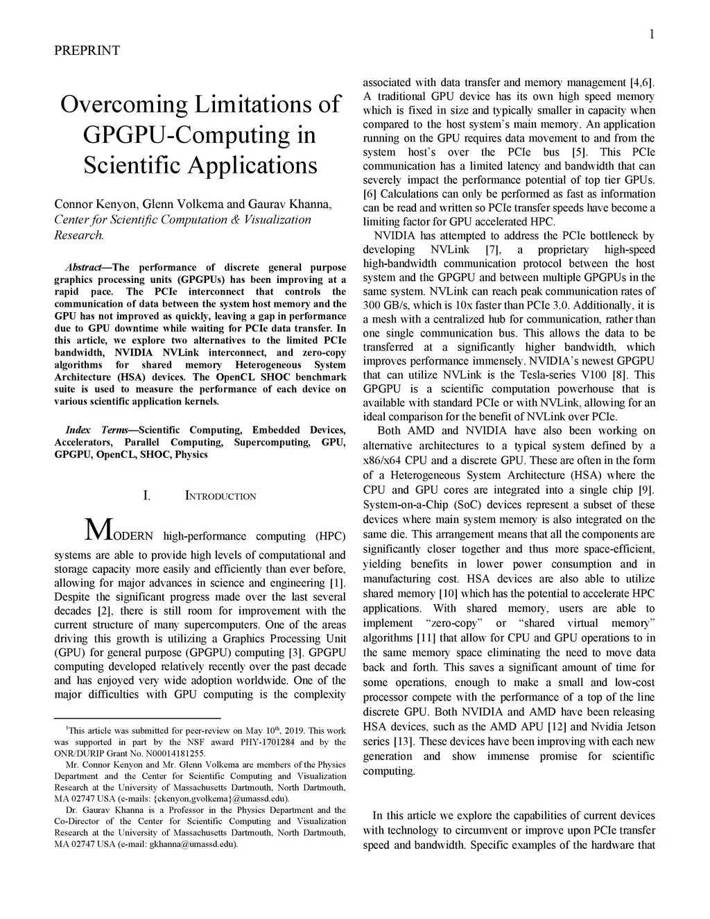 The performance of discrete general purpose graphics processing units (GPGPUs) has been improving at a rapid pace. The PCIe interconnect that controls the communication of data between the system host memory and the GPU has not improved as quickly, leaving a gap in performance due to GPU downtime while waiting for PCIe data transfer. In this article, we explore two alternatives to the limited PCIe bandwidth, NVIDIA NVLink interconnect, and zero-copy algorithms for shared memory Heterogeneous System Architecture (HSA) devices. The OpenCL SHOC benchmark suite is used to measure the performance of each device on various scientific application kernels.