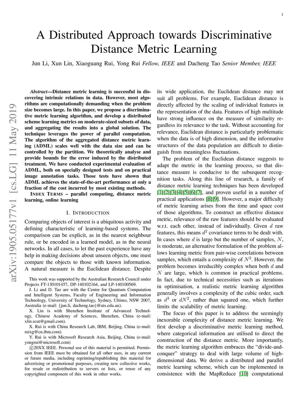 A Distributed Approach towards Discriminative Distance Metric Learning