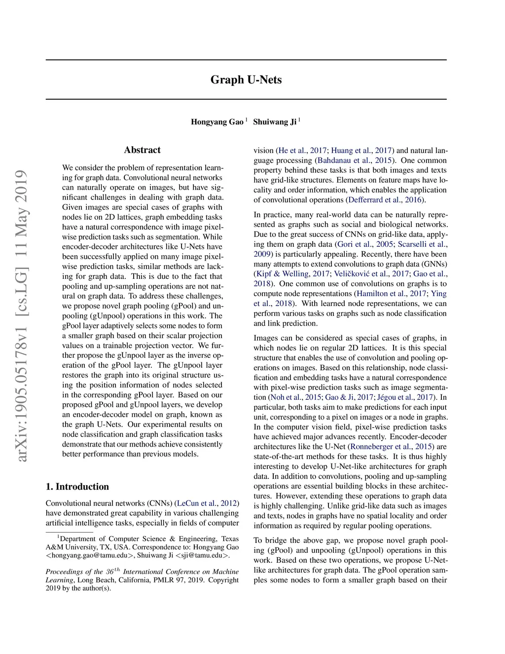 We consider the problem of representation learning for graph data. Convolutional neural networks can naturally operate on images, but have significant challenges in dealing with graph data. Given images are special cases of graphs with nodes lie on 2D lattices, graph embedding tasks have a natural correspondence with image pixel-wise prediction tasks such as segmentation. While encoder-decoder architectures like U-Nets have been successfully applied on many image pixel-wise prediction tasks, similar methods are lacking for graph data. This is due to the fact that pooling and up-sampling operations are not natural on graph data. To address these challenges, we propose novel graph pooling (gPool) and unpooling (gUnpool) operations in this work. The gPool layer adaptively selects some nodes to form a smaller graph based on their scalar projection values on a trainable projection vector. We further propose the gUnpool layer as the inverse operation of the gPool layer. The gUnpool layer restores the graph into its original structure using the position information of nodes selected in the corresponding gPool layer. Based on our proposed gPool and gUnpool layers, we develop an encoder-decoder model on graph, known as the graph U-Nets. Our experimental results on node classification and graph classification tasks demonstrate that our methods achieve consistently better performance than previous models.
