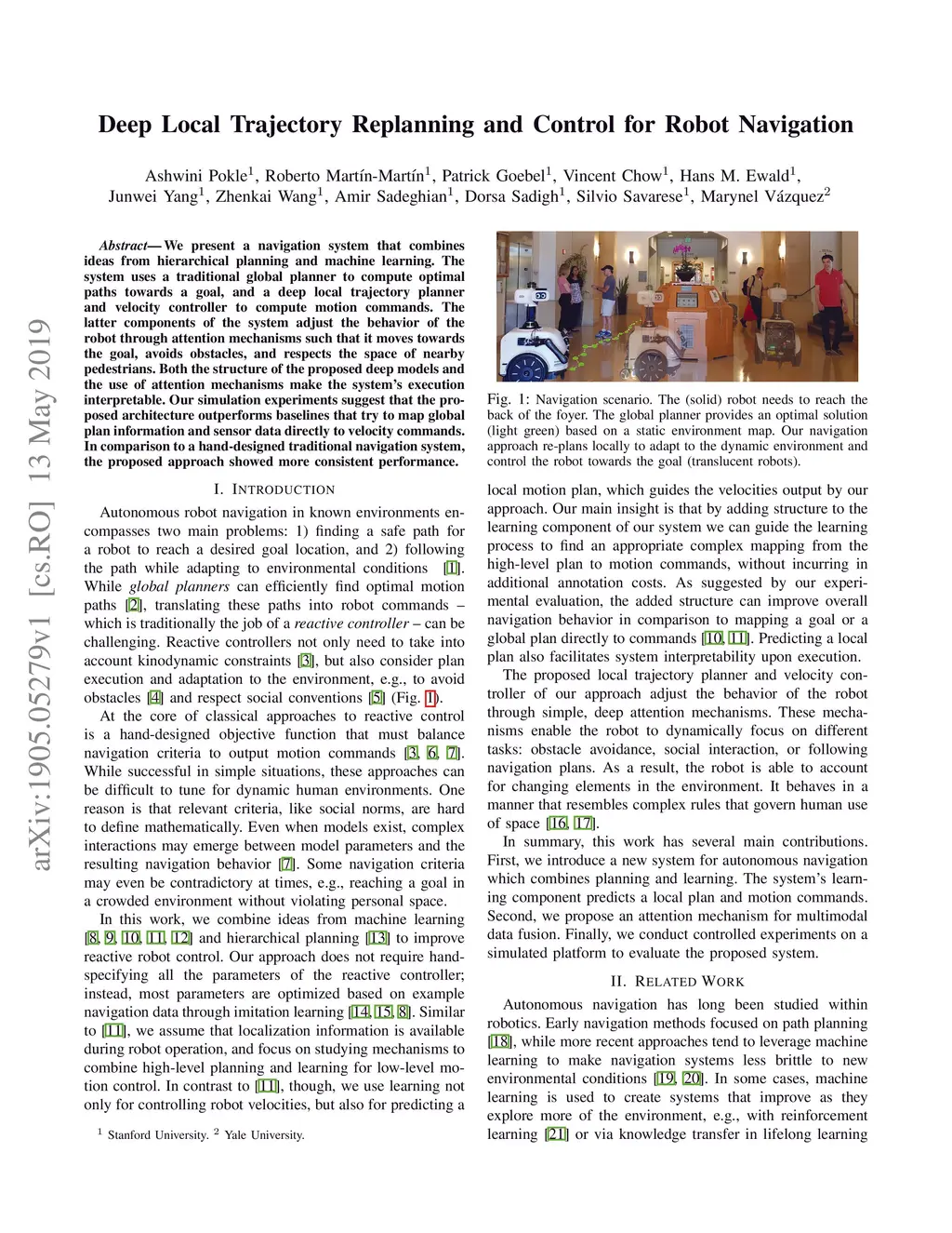 We present a navigation system that combines ideas from hierarchical planning and machine learning. The system uses a traditional global planner to compute optimal paths towards a goal, and a deep local trajectory planner and velocity controller to compute motion commands. The latter components of the system adjust the behavior of the robot through attention mechanisms such that it moves towards the goal, avoids obstacles, and respects the space of nearby pedestrians. Both the structure of the proposed deep models and the use of attention mechanisms make the system's execution interpretable. Our simulation experiments suggest that the proposed architecture outperforms baselines that try to map global plan information and sensor data directly to velocity commands. In comparison to a hand-designed traditional navigation system, the proposed approach showed more consistent performance.