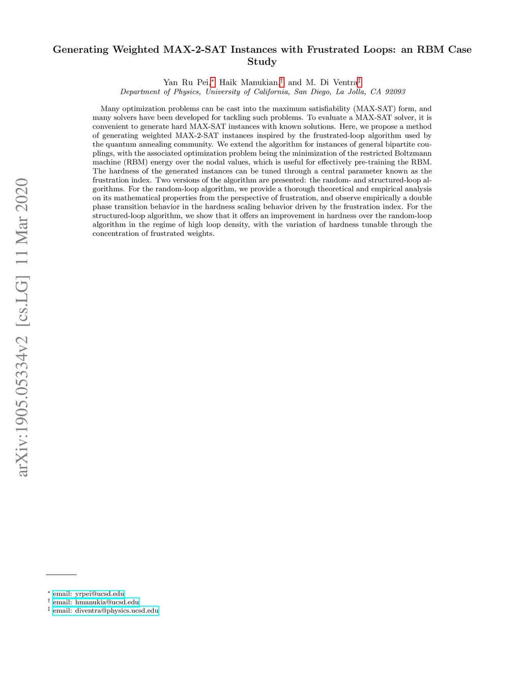 Many optimization problems can be cast into the maximum satisfiability (MAX-SAT) form, and many solvers have been developed for tackling such problems. To evaluate a MAX-SAT solver, it is convenient to generate hard MAX-SAT instances with known solutions. Here, we propose a method of generating weighted MAX-2-SAT instances inspired by the frustrated-loop algorithm used by the quantum annealing community. We extend the algorithm for instances of general bipartite couplings, with the associated optimization problem being the minimization of the restricted Boltzmann machine (RBM) energy over the nodal values, which is useful for effectively pre-training the RBM. The hardness of the generated instances can be tuned through a central parameter known as the frustration index. Two versions of the algorithm are presented: the random- and structured-loop algorithms. For the random-loop algorithm, we provide a thorough theoretical and empirical analysis on its mathematical properties from the perspective of frustration, and observe empirically a double phase transition behavior in the hardness scaling behavior driven by the frustration index. For the structured-loop algorithm, we show that it offers an improvement in hardness over the random-loop algorithm in the regime of high loop density, with the variation of hardness tunable through the concentration of frustrated weights.