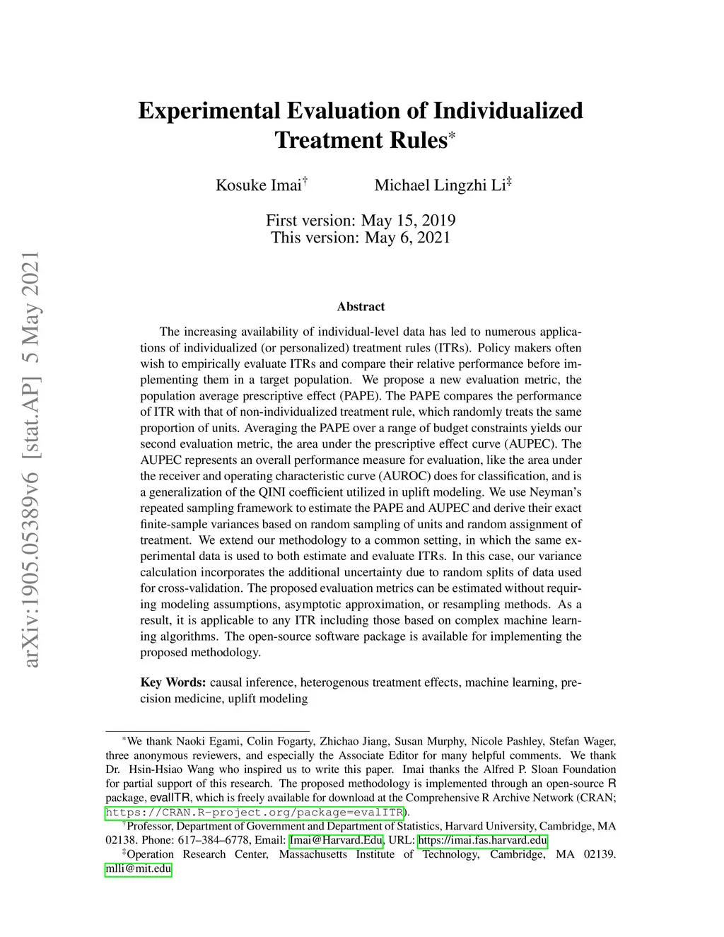 The increasing availability of individual-level data has led to numerous applications of individualized (or personalized) treatment rules (ITRs). Policy makers often wish to empirically evaluate ITRs and compare their relative performance before implementing them in a target population. We propose a new evaluation metric, the population average prescriptive effect (PAPE). The PAPE compares the performance of ITR with that of non-individualized treatment rule, which randomly treats the same proportion of units. Averaging the PAPE over a range of budget constraints yields our second evaluation metric, the area under the prescriptive effect curve (AUPEC). The AUPEC represents an overall performance measure for evaluation, like the area under the receiver and operating characteristic curve (AUROC) does for classification, and is a generalization of the QINI coefficient utilized in uplift modeling. We use Neyman's repeated sampling framework to estimate the PAPE and AUPEC and derive their exact finite-sample variances based on random sampling of units and random assignment of treatment. We extend our methodology to a common setting, in which the same experimental data is used to both estimate and evaluate ITRs. In this case, our variance calculation incorporates the additional uncertainty due to random splits of data used for cross-validation. The proposed evaluation metrics can be estimated without requiring modeling assumptions, asymptotic approximation, or resampling methods. As a result, it is applicable to any ITR including those based on complex machine learning algorithms. The open-source software package is available for implementing the proposed methodology.