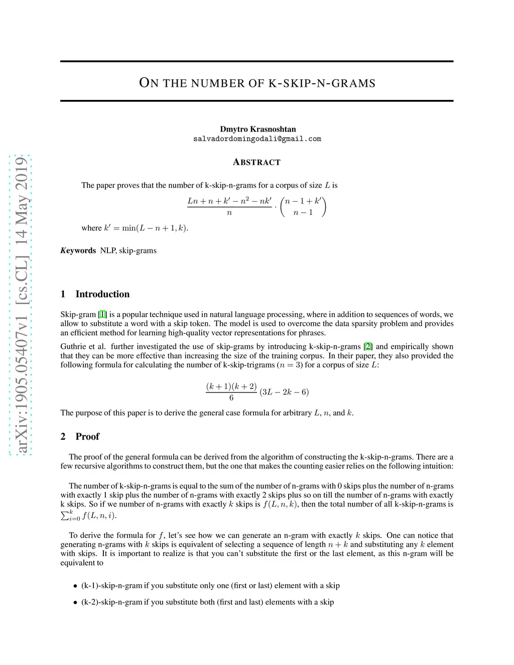 The paper proves that the number of k-skip-n-grams for a corpus of size is where .