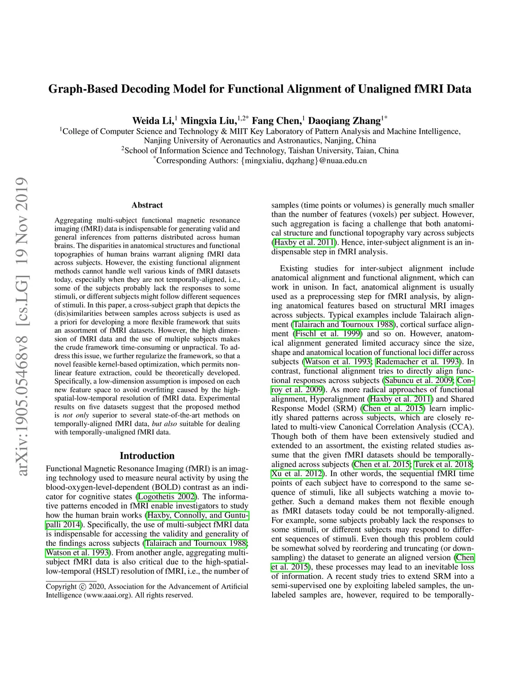 Aggregating multi-subject functional magnetic resonance imaging (fMRI) data is indispensable for generating valid and general inferences from patterns distributed across human brains. The disparities in anatomical structures and functional topographies of human brains warrant aligning fMRI data across subjects. However, the existing functional alignment methods cannot handle well various kinds of fMRI datasets today, especially when they are not temporally-aligned, i.e., some of the subjects probably lack the responses to some stimuli, or different subjects might follow different sequences of stimuli. In this paper, a cross-subject graph that depicts the (dis)similarities between samples across subjects is used as a priori for developing a more flexible framework that suits an assortment of fMRI datasets. However, the high dimension of fMRI data and the use of multiple subjects makes the crude framework time-consuming or unpractical. To address this issue, we further regularize the framework, so that a novel feasible kernel-based optimization, which permits nonlinear feature extraction, could be theoretically developed. Specifically, a low-dimension assumption is imposed on each new feature space to avoid overfitting caused by the highspatial-low-temporal resolution of fMRI data. Experimental results on five datasets suggest that the proposed method is not only superior to several state-of-the-art methods on temporally-aligned fMRI data, but also suitable for dealing `with temporally-unaligned fMRI data.