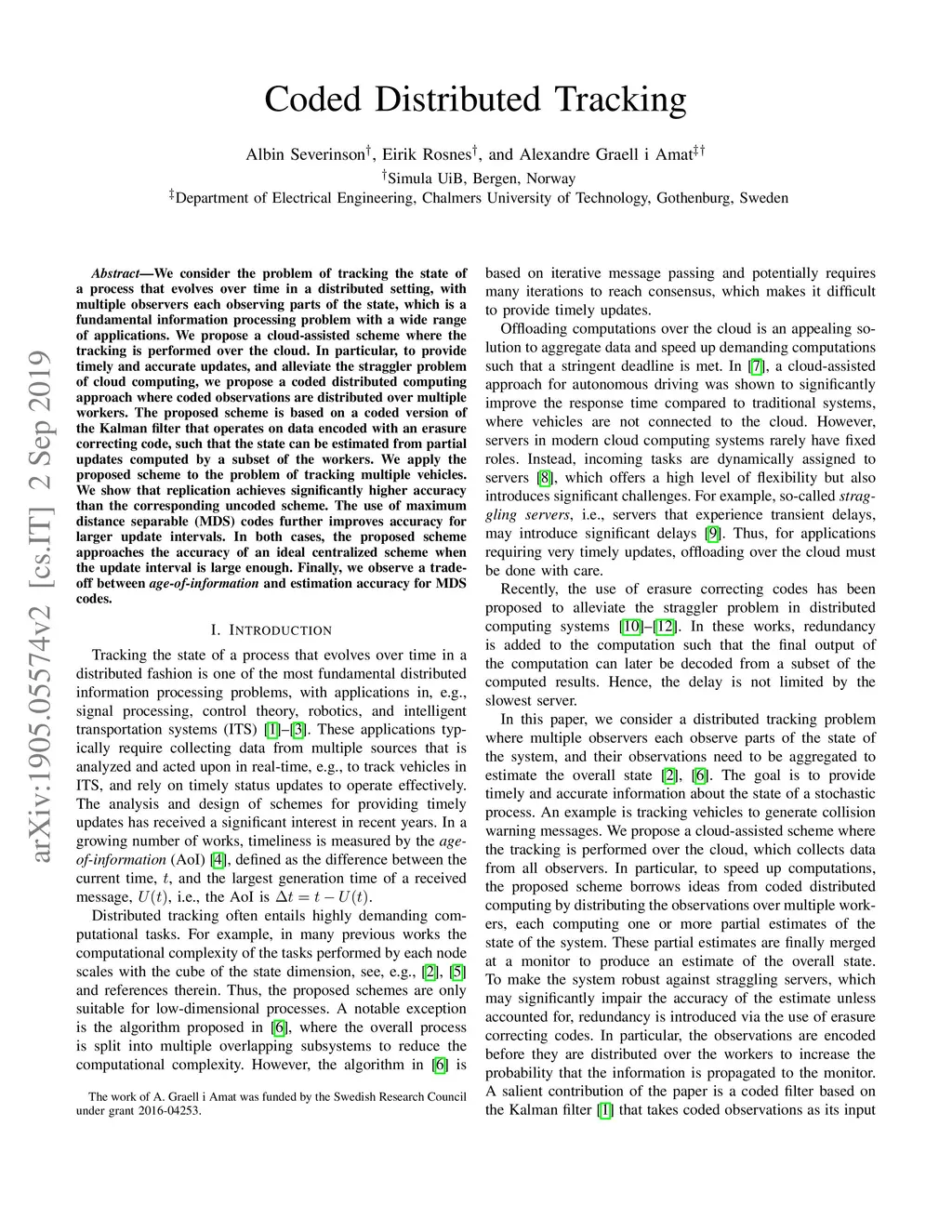 We consider the problem of tracking the state of a process that evolves over time in a distributed setting, with multiple observers each observing parts of the state, which is a fundamental information processing problem with a wide range of applications. We propose a cloud-assisted scheme where the tracking is performed over the cloud. In particular, to provide timely and accurate updates, and alleviate the straggler problem of cloud computing, we propose a coded distributed computing approach where coded observations are distributed over multiple workers. The proposed scheme is based on a coded version of the Kalman filter that operates on data encoded with an erasure correcting code, such that the state can be estimated from partial updates computed by a subset of the workers. We apply the proposed scheme to the problem of tracking multiple vehicles. We show that replication achieves significantly higher accuracy than the corresponding uncoded scheme. The use of maximum distance separable (MDS) codes further improves accuracy for larger update intervals. In both cases, the proposed scheme approaches the accuracy of an ideal centralized scheme when the update interval is large enough. Finally, we observe a trade-off between age-of-information and estimation accuracy for MDS codes.