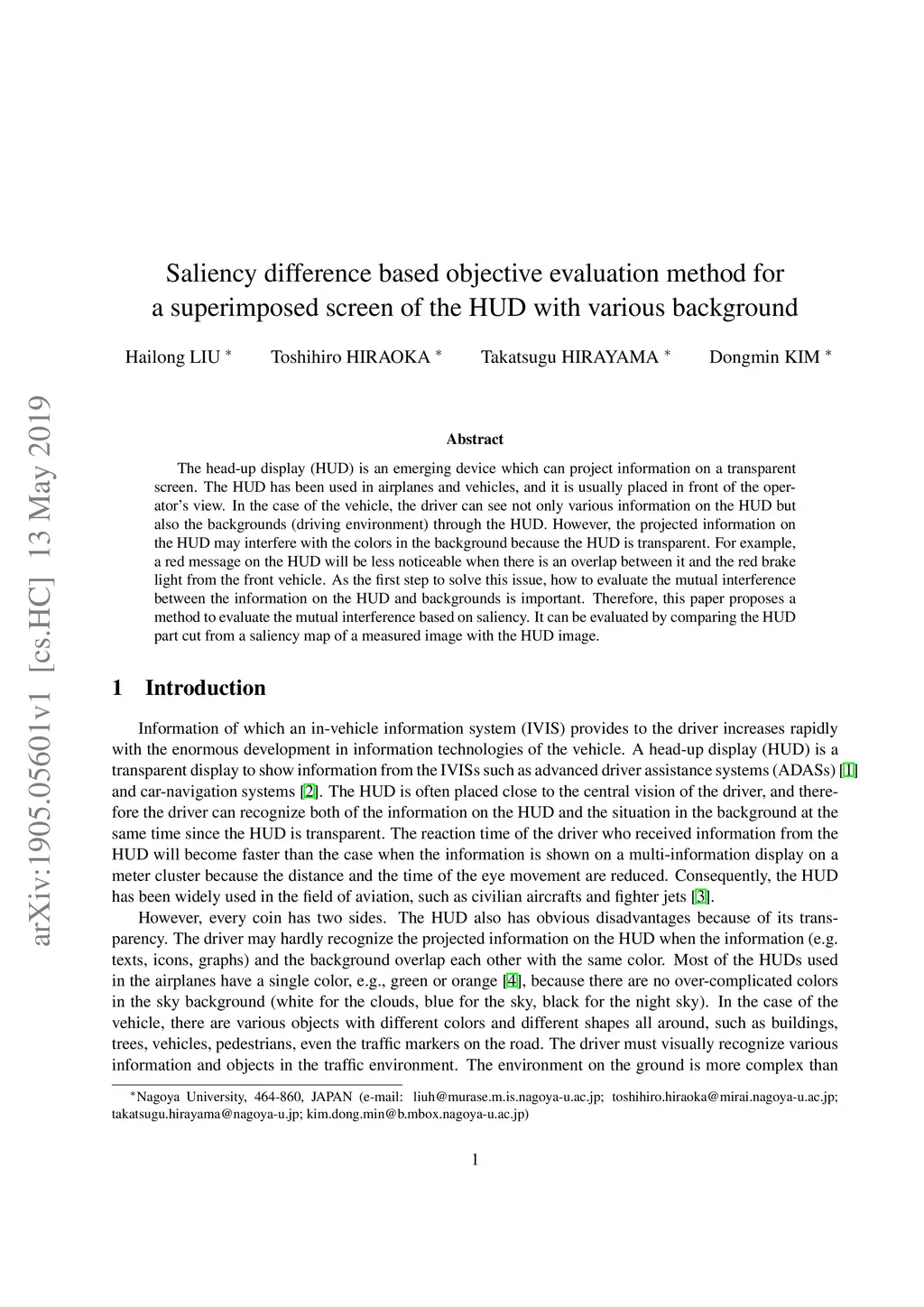 The head-up display (HUD) is an emerging device which can project information on a transparent screen. The HUD has been used in airplanes and vehicles, and it is usually placed in front of the operator's view. In the case of the vehicle, the driver can see not only various information on the HUD but also the backgrounds (driving environment) through the HUD. However, the projected information on the HUD may interfere with the colors in the background because the HUD is transparent. For example, a red message on the HUD will be less noticeable when there is an overlap between it and the red brake light from the front vehicle. As the first step to solve this issue, how to evaluate the mutual interference between the information on the HUD and backgrounds is important. Therefore, this paper proposes a method to evaluate the mutual interference based on saliency. It can be evaluated by comparing the HUD part cut from a saliency map of a measured image with the HUD image.
