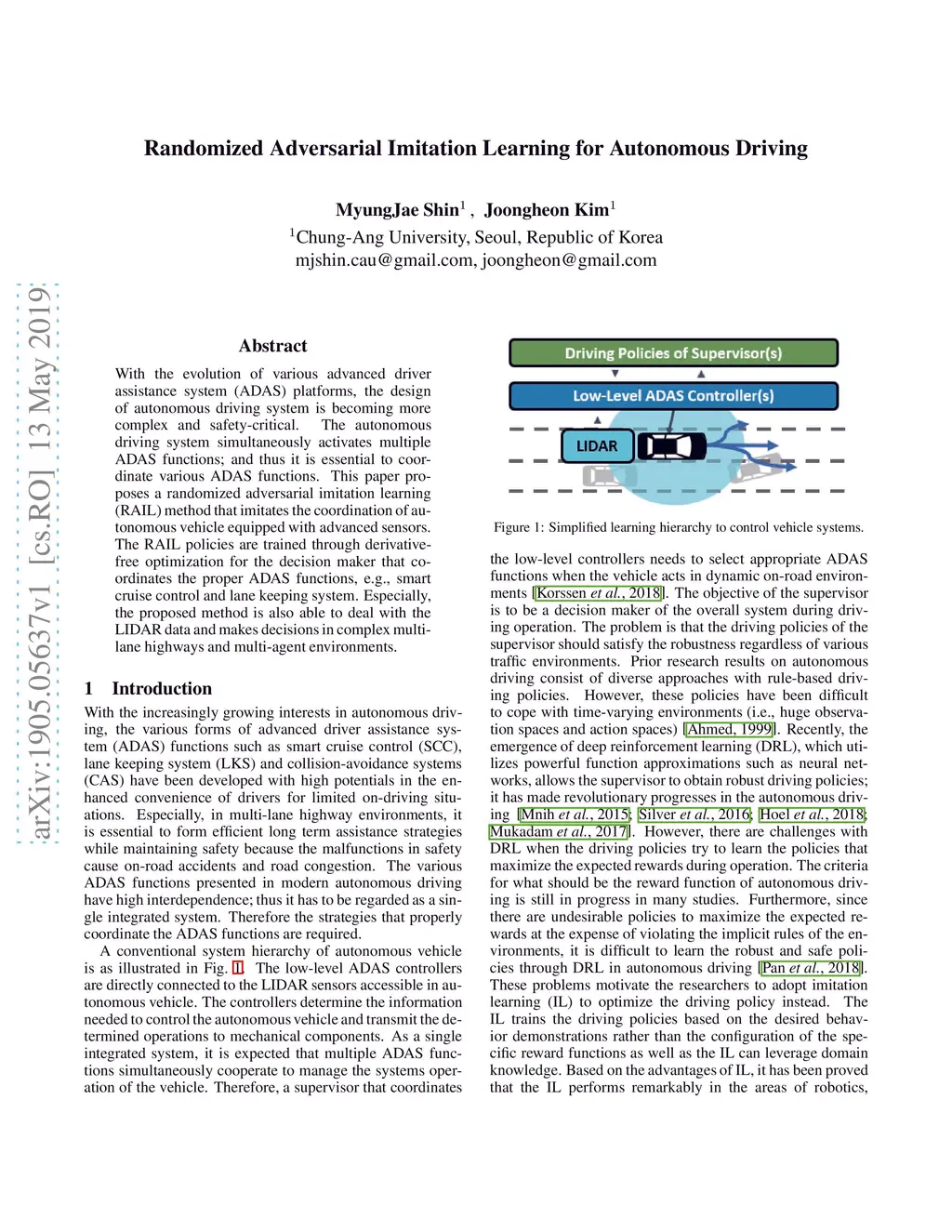 With the evolution of various advanced driver assistance system (ADAS) platforms, the design of autonomous driving system is becoming more complex and safety-critical. The autonomous driving system simultaneously activates multiple ADAS functions; and thus it is essential to coordinate various ADAS functions. This paper proposes a randomized adversarial imitation learning (RAIL) method that imitates the coordination of autonomous vehicle equipped with advanced sensors. The RAIL policies are trained through derivative-free optimization for the decision maker that coordinates the proper ADAS functions, e.g., smart cruise control and lane keeping system. Especially, the proposed method is also able to deal with the LIDAR data and makes decisions in complex multi-lane highways and multi-agent environments.