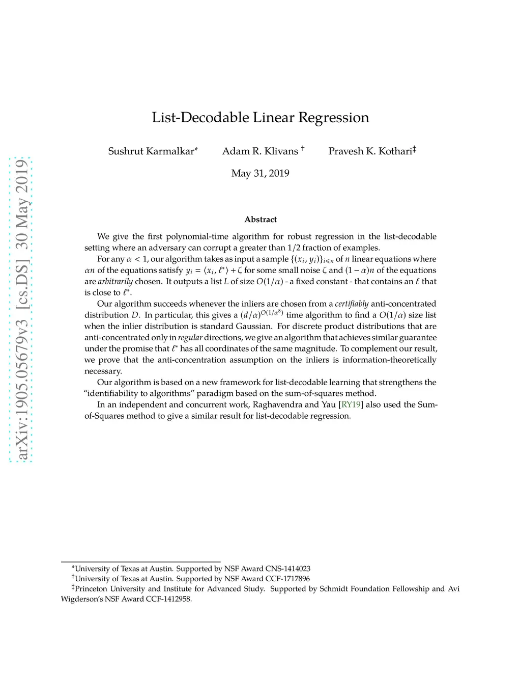 We give the first polynomial-time algorithm for robust regression in the list-decodable setting where an adversary can corrupt a greater than fraction of examples. For any , our algorithm takes as input a sample of linear equations where of the equations satisfy for some small noise and of the equations are {\em arbitrarily} chosen. It outputs a list of size - a fixed constant - that contains an that is close to . Our algorithm succeeds whenever the inliers are chosen from a \emph{certifiably} anti-concentrated distribution . In particular, this gives a time algorithm to find a size list when the inlier distribution is standard Gaussian. For discrete product distributions that are anti-concentrated only in \emph{regular} directions, we give an algorithm that achieves similar guarantee under the promise that has all coordinates of the same magnitude. To complement our result, we prove that the anti-concentration assumption on the inliers is information-theoretically necessary. Our algorithm is based on a new framework for list-decodable learning that strengthens the `identifiability to algorithms' paradigm based on the sum-of-squares method. In an independent and concurrent work, Raghavendra and Yau also used the Sum-of-Squares method to give a similar result for list-decodable regression.