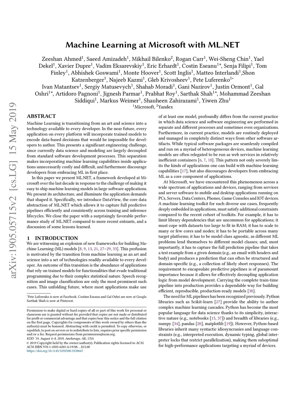 Machine Learning is transitioning from an art and science into a technology available to every developer. In the near future, every application on every platform will incorporate trained models to encode data-based decisions that would be impossible for developers to author. This presents a significant engineering challenge, since currently data science and modeling are largely decoupled from standard software development processes. This separation makes incorporating machine learning capabilities inside applications unnecessarily costly and difficult, and furthermore discourage developers from embracing ML in first place. In this paper we present ML .NET, a framework developed at Microsoft over the last decade in response to the challenge of making it easy to ship machine learning models in large software applications. We present its architecture, and illuminate the application demands that shaped it. Specifically, we introduce DataView, the core data abstraction of ML .NET which allows it to capture full predictive pipelines efficiently and consistently across training and inference lifecycles. We close the paper with a surprisingly favorable performance study of ML .NET compared to more recent entrants, and a discussion of some lessons learned.