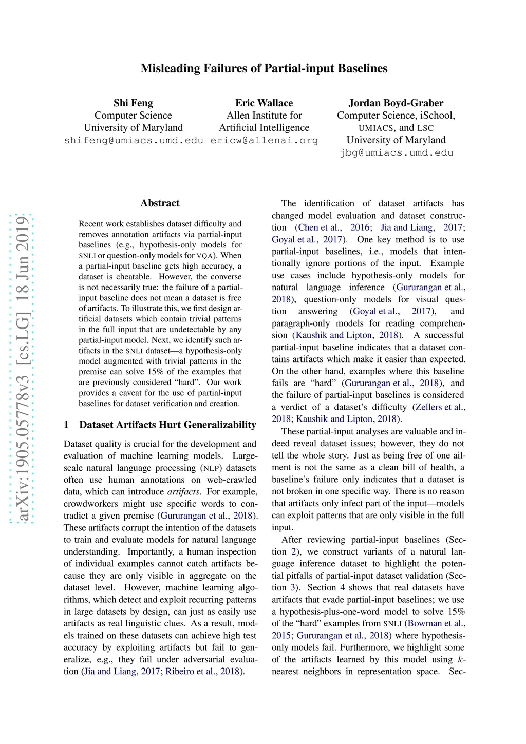 Recent work establishes dataset difficulty and removes annotation artifacts via partial-input baselines (e.g., hypothesis-only models for SNLI or question-only models for VQA). When a partial-input baseline gets high accuracy, a dataset is cheatable. However, the converse is not necessarily true: the failure of a partial-input baseline does not mean a dataset is free of artifacts. To illustrate this, we first design artificial datasets which contain trivial patterns in the full input that are undetectable by any partial-input model. Next, we identify such artifacts in the SNLI dataset - a hypothesis-only model augmented with trivial patterns in the premise can solve 15% of the examples that are previously considered "hard". Our work provides a caveat for the use of partial-input baselines for dataset verification and creation.