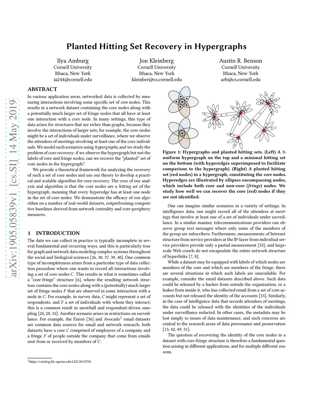 In various application areas, networked data is collected by measuring interactions involving some specific set of core nodes. This results in a network dataset containing the core nodes along with a potentially much larger set of fringe nodes that all have at least one interaction with a core node. In many settings, this type of data arises for structures that are richer than graphs, because they involve the interactions of larger sets; for example, the core nodes might be a set of individuals under surveillance, where we observe the attendees of meetings involving at least one of the core individuals. We model such scenarios using hypergraphs, and we study the problem of core recovery: if we observe the hypergraph but not the labels of core and fringe nodes, can we recover the "planted" set of core nodes in the hypergraph? We provide a theoretical framework for analyzing the recovery of such a set of core nodes and use our theory to develop a practical and scalable algorithm for core recovery. The crux of our analysis and algorithm is that the core nodes are a hitting set of the hypergraph, meaning that every hyperedge has at least one node in the set of core nodes. We demonstrate the efficacy of our algorithm on a number of real-world datasets, outperforming competitive baselines derived from network centrality and core-periphery measures.