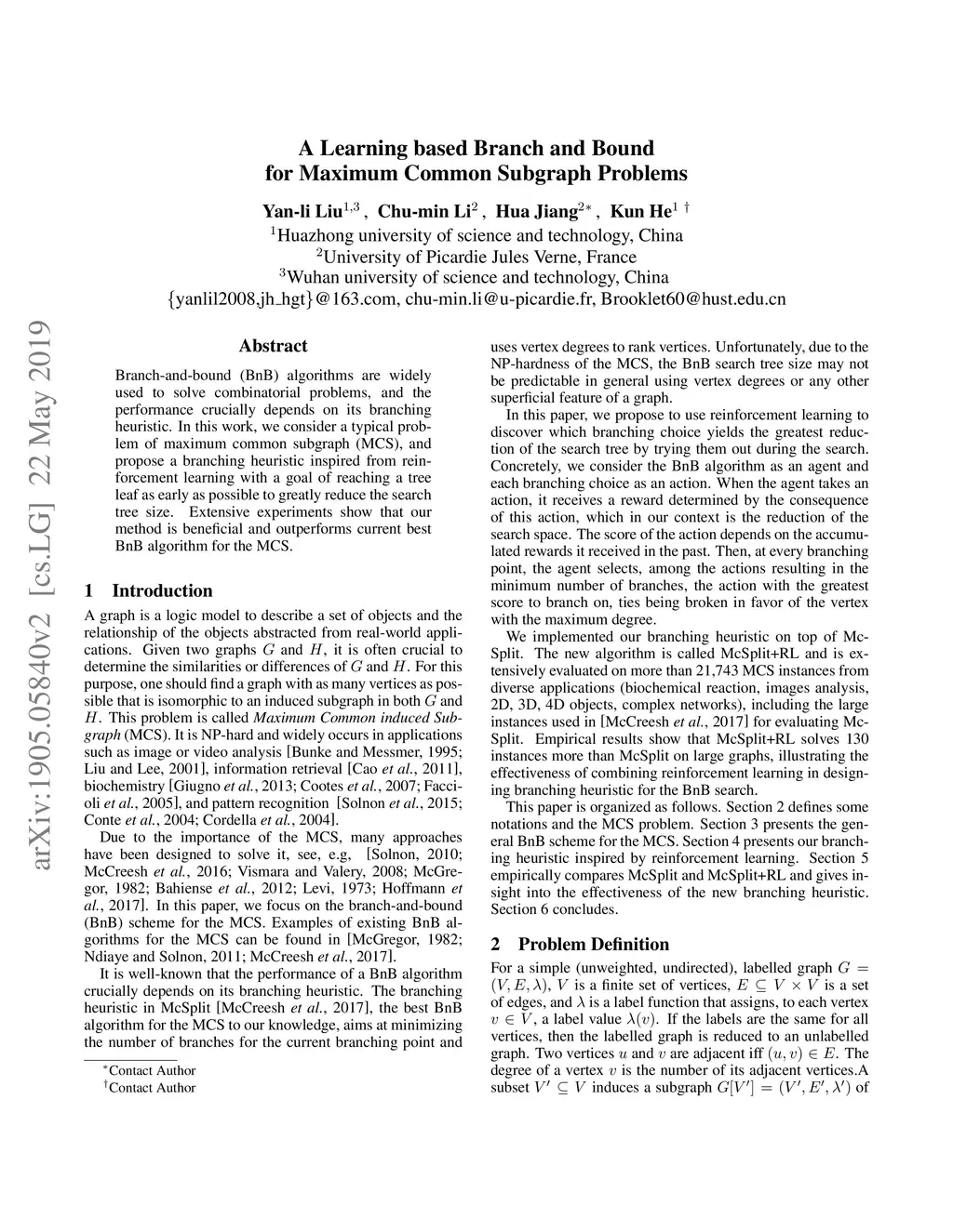 Branch-and-bound (BnB) algorithms are widely used to solve combinatorial problems, and the performance crucially depends on its branching heuristic.In this work, we consider a typical problem of maximum common subgraph (MCS), and propose a branching heuristic inspired from reinforcement learning with a goal of reaching a tree leaf as early as possible to greatly reduce the search tree size.Extensive experiments show that our method is beneficial and outperforms current best BnB algorithm for the MCS.