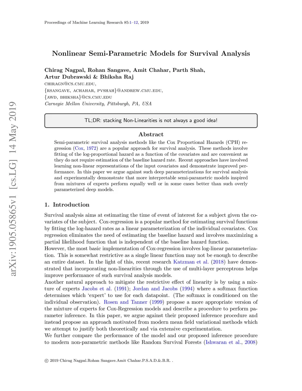 Semi-parametric survival analysis methods like the Cox Proportional Hazards (CPH) regression (Cox, 1972) are a popular approach for survival analysis. These methods involve fitting of the log-proportional hazard as a function of the covariates and are convenient as they do not require estimation of the baseline hazard rate. Recent approaches have involved learning non-linear representations of the input covariates and demonstrate improved performance. In this paper we argue against such deep parameterizations for survival analysis and experimentally demonstrate that more interpretable semi-parametric models inspired from mixtures of experts perform equally well or in some cases better than such overly parameterized deep models.