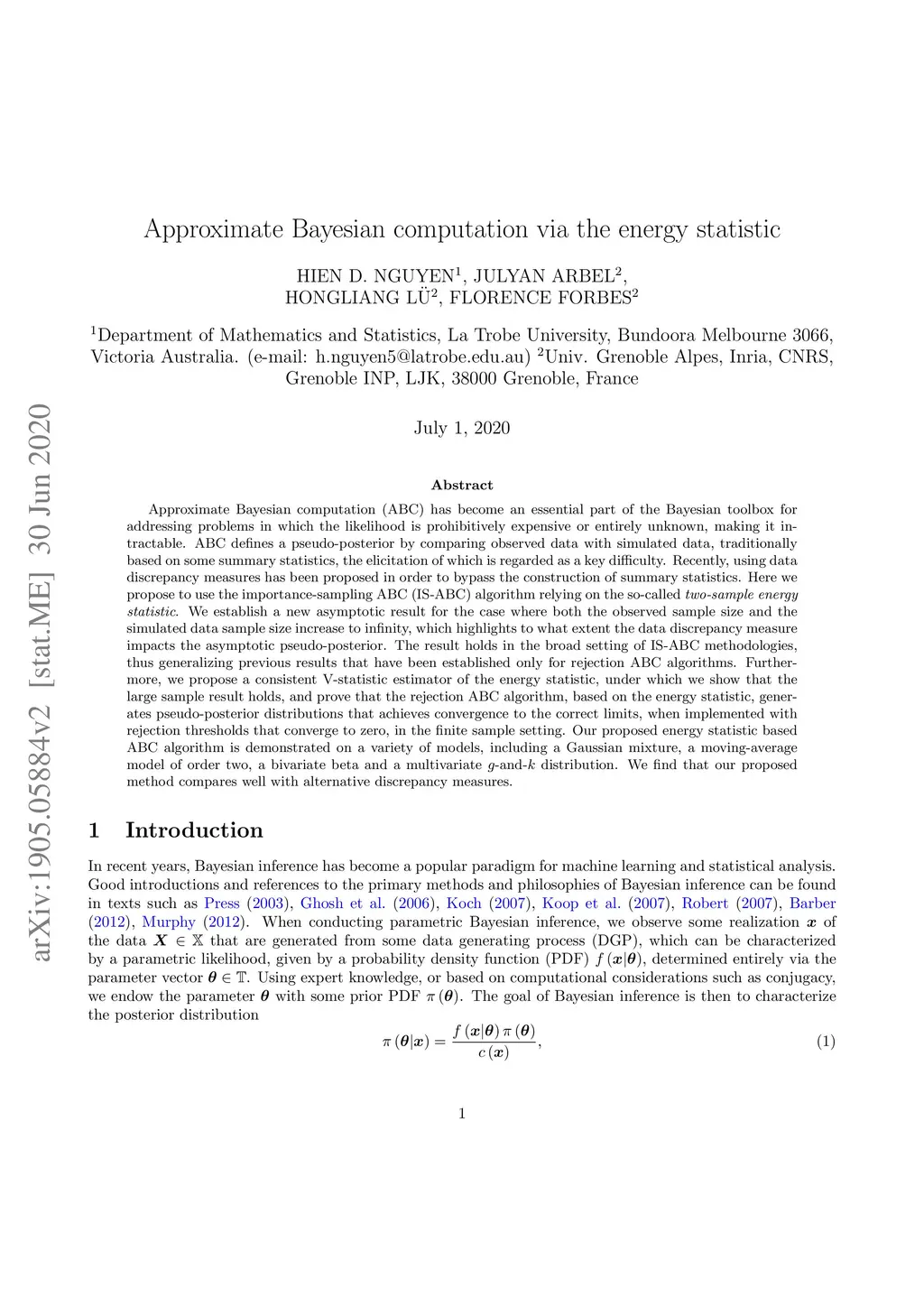 Approximate Bayesian computation (ABC) has become an essential part of the Bayesian toolbox for addressing problems in which the likelihood is prohibitively expensive or entirely unknown, making it intractable. ABC defines a pseudo-posterior by comparing observed data with simulated data, traditionally based on some summary statistics, the elicitation of which is regarded as a key difficulty. Recently, using data discrepancy measures has been proposed in order to bypass the construction of summary statistics. Here we propose to use the importance-sampling ABC (IS-ABC) algorithm relying on the so-called two-sample energy statistic. We establish a new asymptotic result for the case where both the observed sample size and the simulated data sample size increase to infinity, which highlights to what extent the data discrepancy measure impacts the asymptotic pseudo-posterior. The result holds in the broad setting of IS-ABC methodologies, thus generalizing previous results that have been established only for rejection ABC algorithms. Furthermore, we propose a consistent V-statistic estimator of the energy statistic, under which we show that the large sample result holds, and prove that the rejection ABC algorithm, based on the energy statistic, generates pseudo-posterior distributions that achieves convergence to the correct limits, when implemented with rejection thresholds that converge to zero, in the finite sample setting. Our proposed energy statistic based ABC algorithm is demonstrated on a variety of models, including a Gaussian mixture, a moving-average model of order two, a bivariate beta and a multivariate -and- distribution. We find that our proposed method compares well with alternative discrepancy measures.