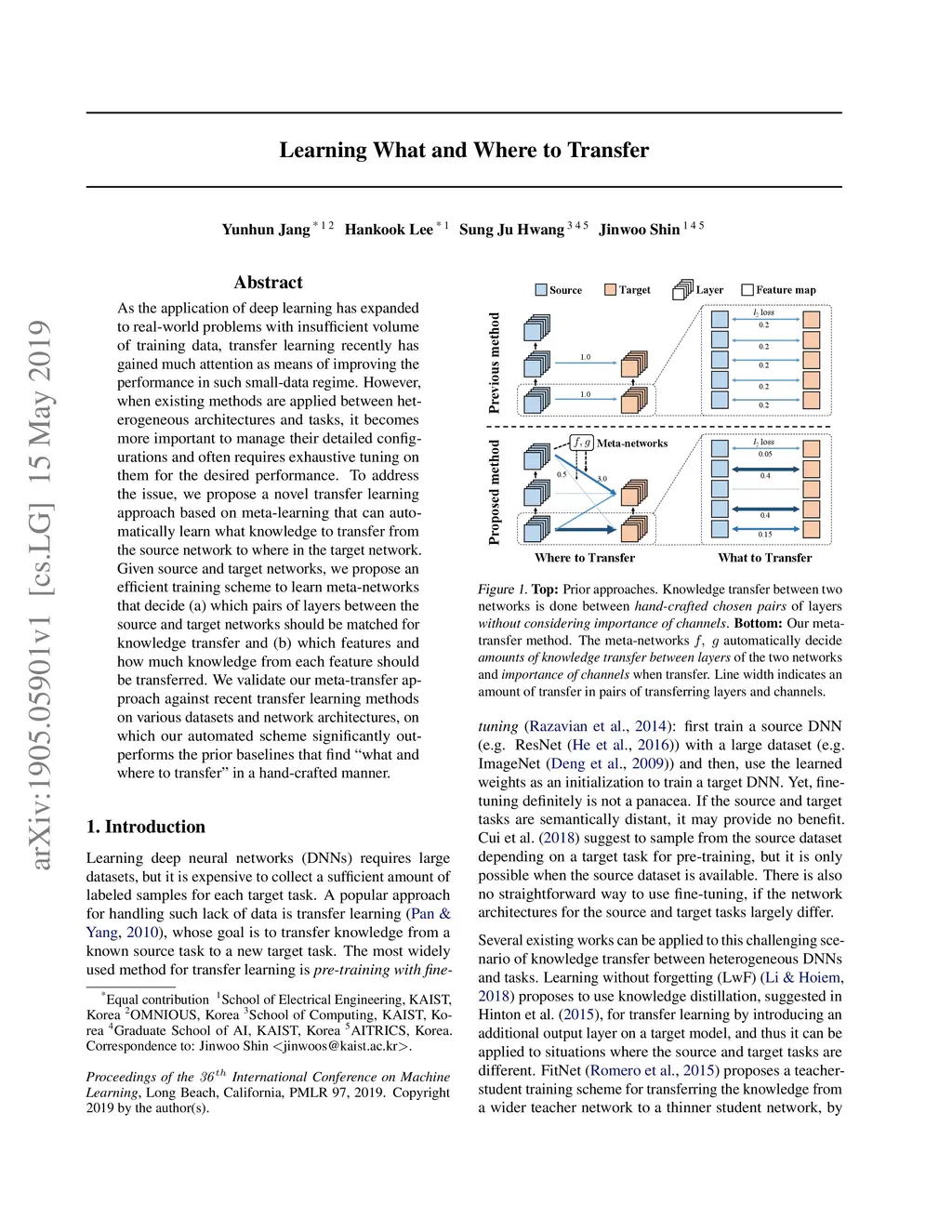 As the application of deep learning has expanded to real-world problems with insufficient volume of training data, transfer learning recently has gained much attention as means of improving the performance in such small-data regime. However, when existing methods are applied between heterogeneous architectures and tasks, it becomes more important to manage their detailed configurations and often requires exhaustive tuning on them for the desired performance. To address the issue, we propose a novel transfer learning approach based on meta-learning that can automatically learn what knowledge to transfer from the source network to where in the target network. Given source and target networks, we propose an efficient training scheme to learn meta-networks that decide (a) which pairs of layers between the source and target networks should be matched for knowledge transfer and (b) which features and how much knowledge from each feature should be transferred. We validate our meta-transfer approach against recent transfer learning methods on various datasets and network architectures, on which our automated scheme significantly outperforms the prior baselines that find "what and where to transfer" in a hand-crafted manner.