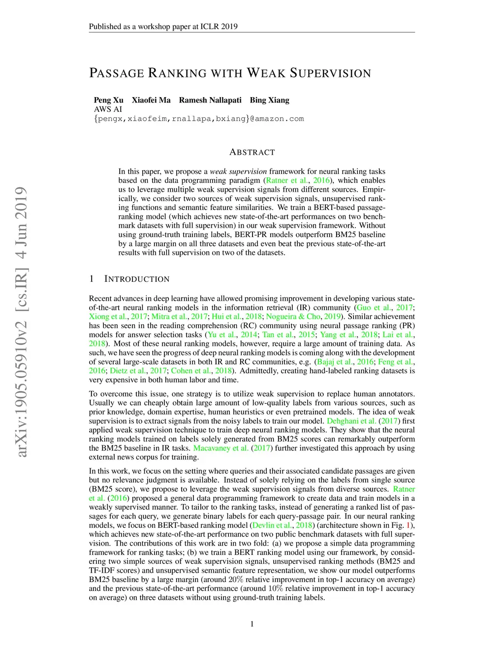 In this paper, we propose a \textit{weak supervision} framework for neural ranking tasks based on the data programming paradigm \citep{Ratner2016}, which enables us to leverage multiple weak supervision signals from different sources. Empirically, we consider two sources of weak supervision signals, unsupervised ranking functions and semantic feature similarities. We train a BERT-based passage-ranking model (which achieves new state-of-the-art performances on two benchmark datasets with full supervision) in our weak supervision framework. Without using ground-truth training labels, BERT-PR models outperform BM25 baseline by a large margin on all three datasets and even beat the previous state-of-the-art results with full supervision on two of the datasets.