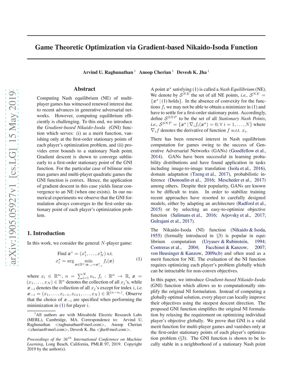 Computing Nash equilibrium (NE) of multi-player games has witnessed renewed interest due to recent advances in generative adversarial networks. However, computing equilibrium efficiently is challenging. To this end, we introduce the Gradient-based Nikaido-Isoda (GNI) function which serves: (i) as a merit function, vanishing only at the first-order stationary points of each player's optimization problem, and (ii) provides error bounds to a stationary Nash point. Gradient descent is shown to converge sublinearly to a first-order stationary point of the GNI function. For the particular case of bilinear min-max games and multi-player quadratic games, the GNI function is convex. Hence, the application of gradient descent in this case yields linear convergence to an NE (when one exists). In our numerical experiments, we observe that the GNI formulation always converges to the first-order stationary point of each player's optimization problem.