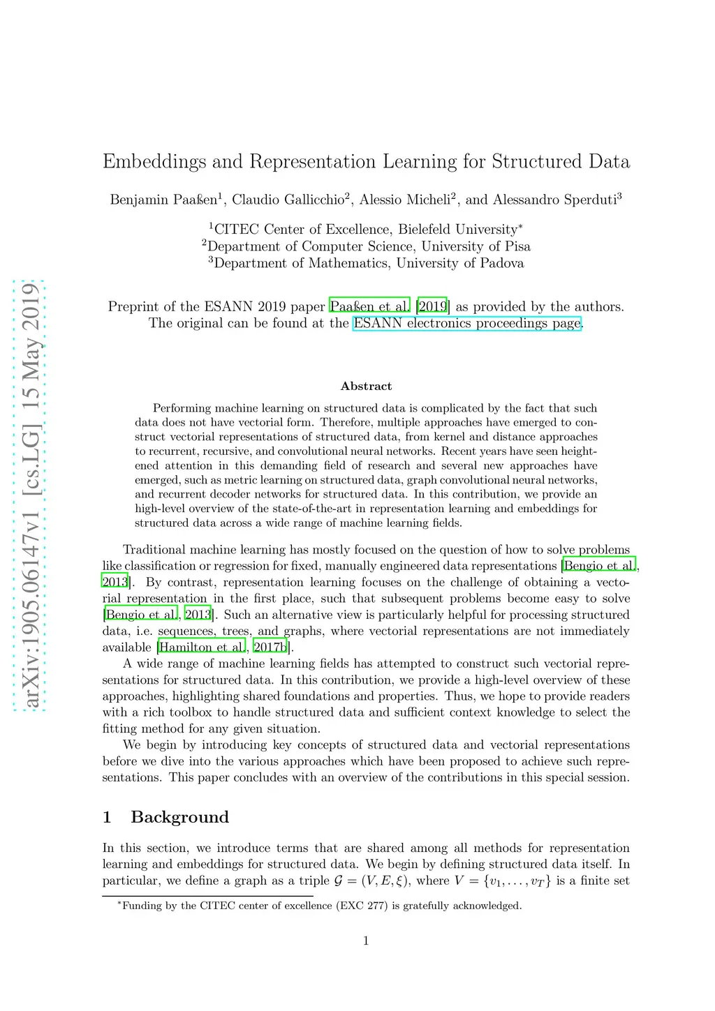 Performing machine learning on structured data is complicated by the fact that such data does not have vectorial form. Therefore, multiple approaches have emerged to construct vectorial representations of structured data, from kernel and distance approaches to recurrent, recursive, and convolutional neural networks. Recent years have seen heightened attention in this demanding field of research and several new approaches have emerged, such as metric learning on structured data, graph convolutional neural networks, and recurrent decoder networks for structured data. In this contribution, we provide an high-level overview of the state-of-the-art in representation learning and embeddings for structured data across a wide range of machine learning fields.