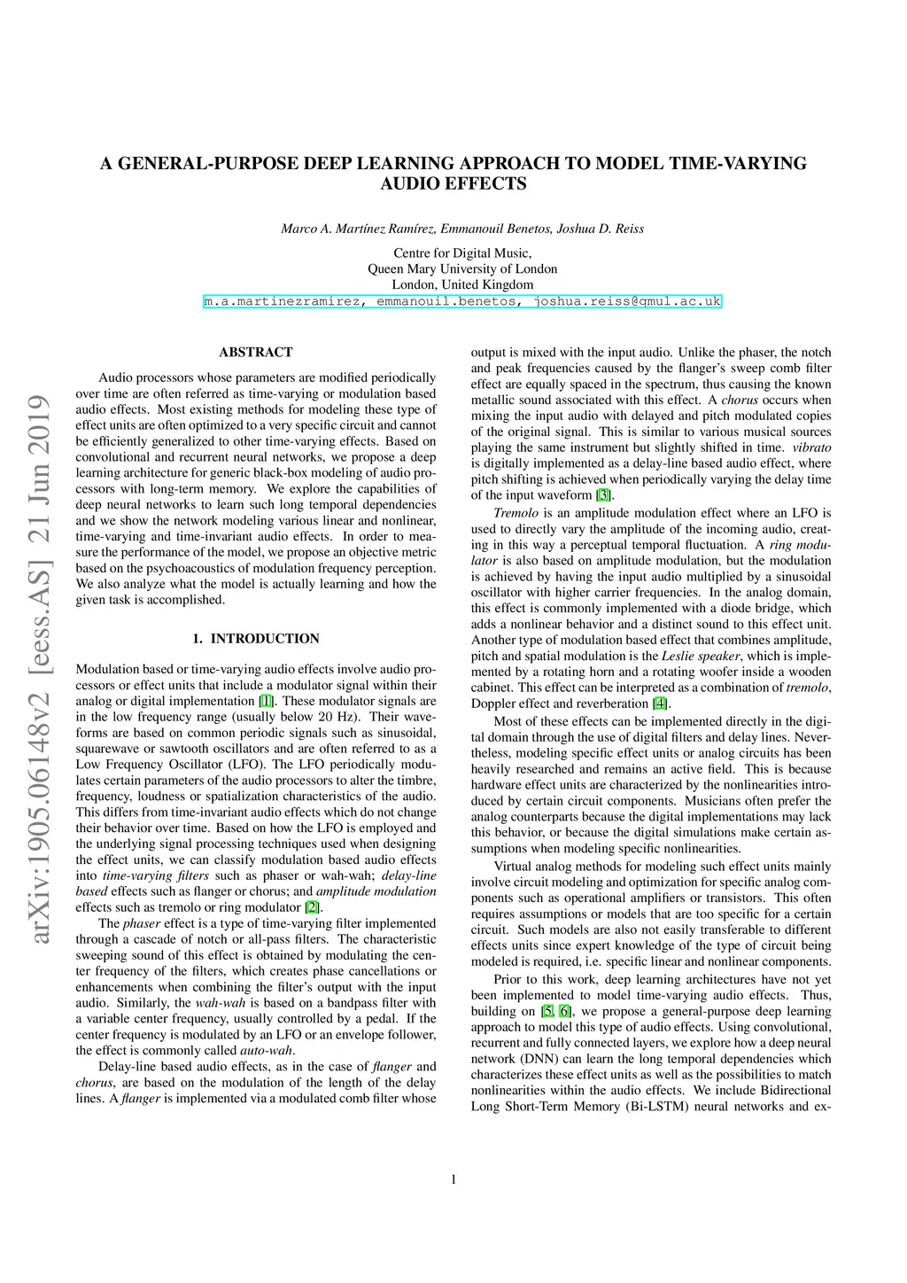 Audio processors whose parameters are modified periodically over time are often referred as time-varying or modulation based audio effects. Most existing methods for modeling these type of effect units are often optimized to a very specific circuit and cannot be efficiently generalized to other time-varying effects. Based on convolutional and recurrent neural networks, we propose a deep learning architecture for generic black-box modeling of audio processors with long-term memory. We explore the capabilities of deep neural networks to learn such long temporal dependencies and we show the network modeling various linear and nonlinear, time-varying and time-invariant audio effects. In order to measure the performance of the model, we propose an objective metric based on the psychoacoustics of modulation frequency perception. We also analyze what the model is actually learning and how the given task is accomplished.