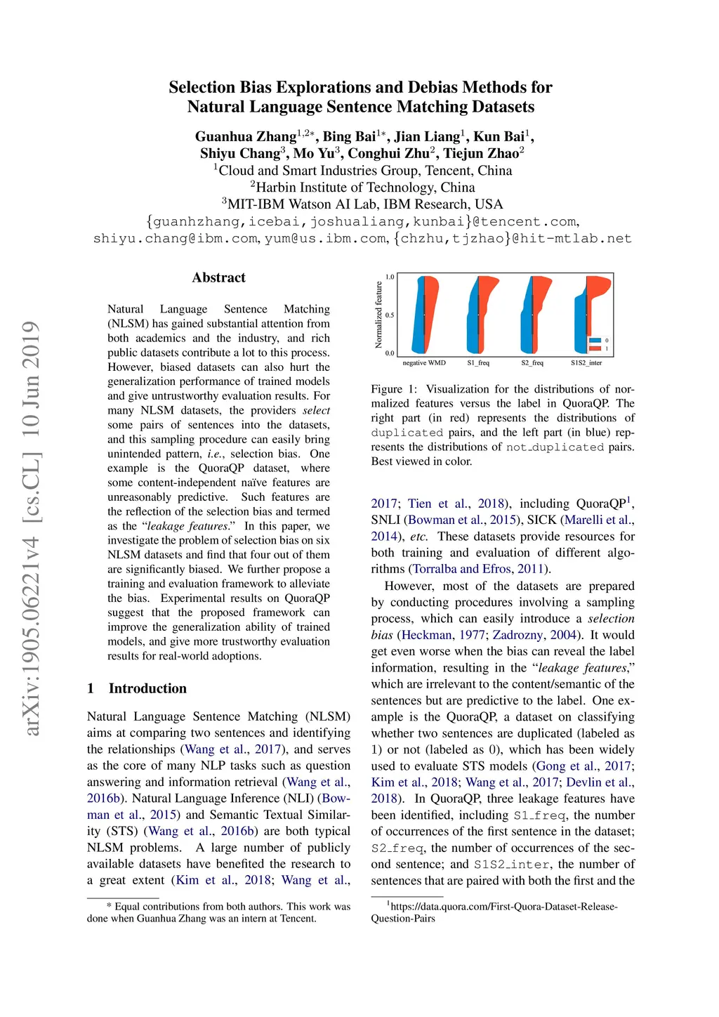 Natural Language Sentence Matching (NLSM) has gained substantial attention from both academics and the industry, and rich public datasets contribute a lot to this process. However, biased datasets can also hurt the generalization performance of trained models and give untrustworthy evaluation results. For many NLSM datasets, the providers select some pairs of sentences into the datasets, and this sampling procedure can easily bring unintended pattern, i.e., selection bias. One example is the QuoraQP dataset, where some content-independent naive features are unreasonably predictive. Such features are the reflection of the selection bias and termed as the leakage features. In this paper, we investigate the problem of selection bias on six NLSM datasets and find that four out of them are significantly biased. We further propose a training and evaluation framework to alleviate the bias. Experimental results on QuoraQP suggest that the proposed framework can improve the generalization ability of trained models, and give more trustworthy evaluation results for real-world adoptions.