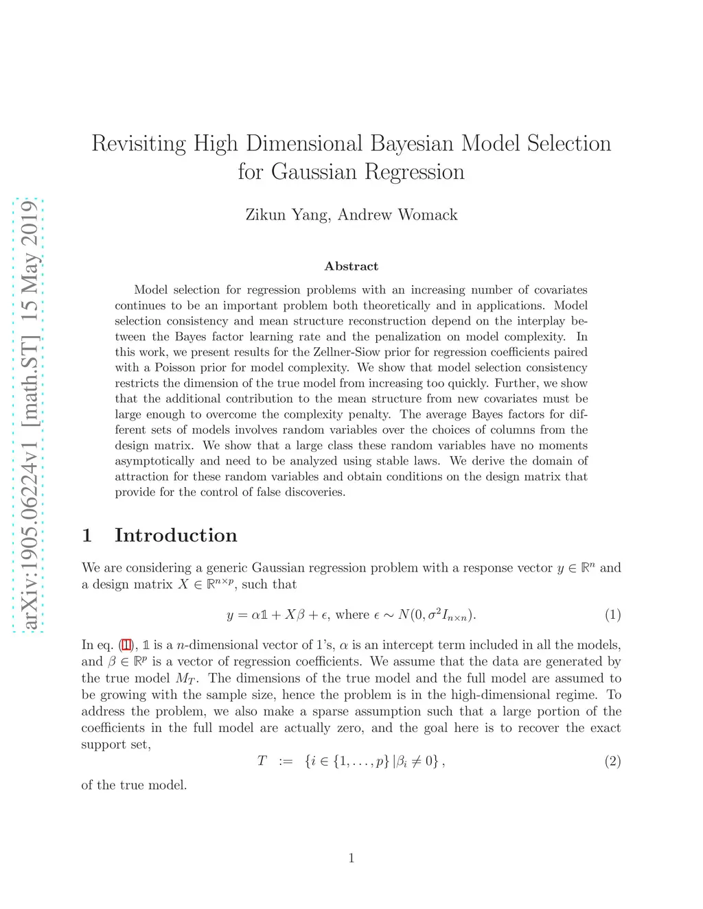 Model selection for regression problems with an increasing number of covariates continues to be an important problem both theoretically and in applications. Model selection consistency and mean structure reconstruction depend on the interplay between the Bayes factor learning rate and the penalization on model complexity. In this work, we present results for the Zellner-Siow prior for regression coefficients paired with a Poisson prior for model complexity. We show that model selection consistency restricts the dimension of the true model from increasing too quickly. Further, we show that the additional contribution to the mean structure from new covariates must be large enough to overcome the complexity penalty. The average Bayes factors for different sets of models involves random variables over the choices of columns from the design matrix. We show that a large class these random variables have no moments asymptotically and need to be analyzed using stable laws. We derive the domain of attraction for these random variables and obtain conditions on the design matrix that provide for the control of false discoveries.