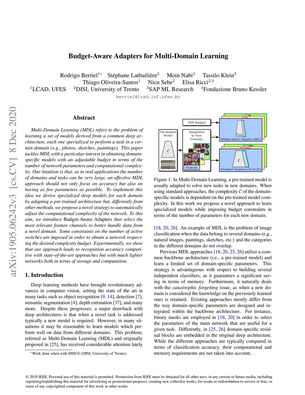 Multi-Domain Learning (MDL) refers to the problem of learning a set of models derived from a common deep architecture, each one specialized to perform a task in a certain domain (e.g., photos, sketches, paintings). This paper tackles MDL with a particular interest in obtaining domain-specific models with an adjustable budget in terms of the number of network parameters and computational complexity. Our intuition is that, as in real applications the number of domains and tasks can be very large, an effective MDL approach should not only focus on accuracy but also on having as few parameters as possible. To implement this idea we derive specialized deep models for each domain by adapting a pre-trained architecture but, differently from other methods, we propose a novel strategy to automatically adjust the computational complexity of the network. To this aim, we introduce Budget-Aware Adapters that select the most relevant feature channels to better handle data from a novel domain. Some constraints on the number of active switches are imposed in order to obtain a network respecting the desired complexity budget. Experimentally, we show that our approach leads to recognition accuracy competitive with state-of-the-art approaches but with much lighter networks both in terms of storage and computation.