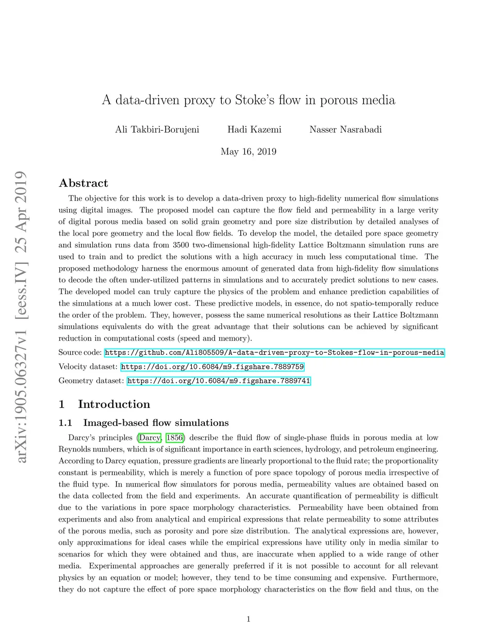 The objective for this work is to develop a data-driven proxy to high-fidelity numerical flow simulations using digital images. The proposed model can capture the flow field and permeability in a large verity of digital porous media based on solid grain geometry and pore size distribution by detailed analyses of the local pore geometry and the local flow fields. To develop the model, the detailed pore space geometry and simulation runs data from 3500 two-dimensional high-fidelity Lattice Boltzmann simulation runs are used to train and to predict the solutions with a high accuracy in much less computational time. The proposed methodology harness the enormous amount of generated data from high-fidelity flow simulations to decode the often under-utilized patterns in simulations and to accurately predict solutions to new cases. The developed model can truly capture the physics of the problem and enhance prediction capabilities of the simulations at a much lower cost. These predictive models, in essence, do not spatio-temporally reduce the order of the problem. They, however, possess the same numerical resolutions as their Lattice Boltzmann simulations equivalents do with the great advantage that their solutions can be achieved by significant reduction in computational costs (speed and memory).