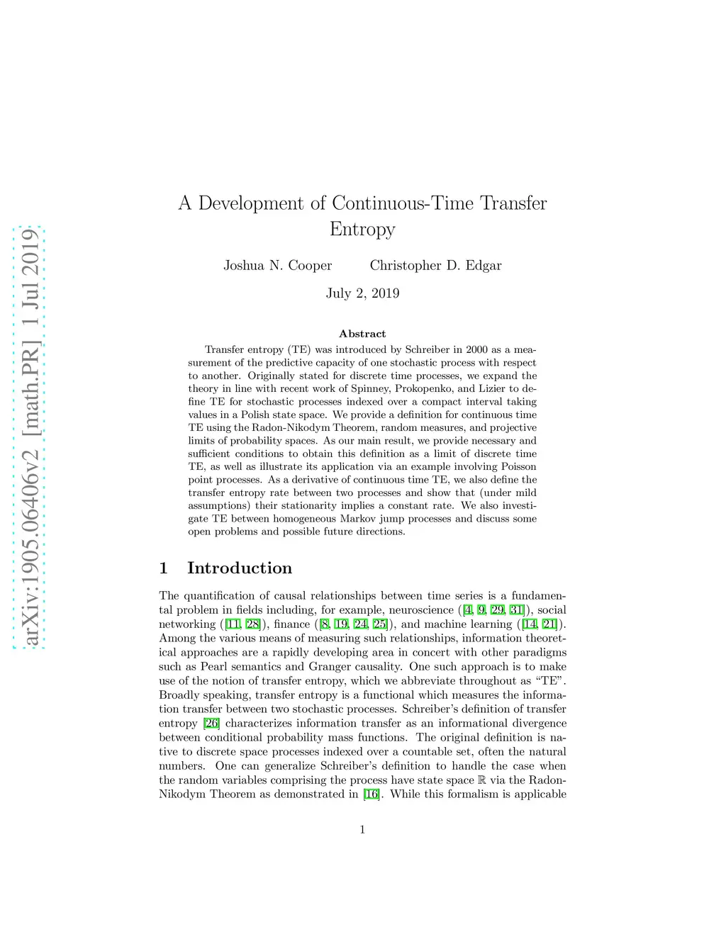 Transfer entropy (TE) was introduced by Schreiber in 2000 as a measurement of the predictive capacity of one stochastic process with respect to another. Originally stated for discrete time processes, we expand the theory in line with recent work of Spinney, Prokopenko, and Lizier to define TE for stochastic processes indexed over a compact interval taking values in a Polish state space. We provide a definition for continuous time TE using the Radon-Nikodym Theorem, random measures, and projective limits of probability spaces. As our main result, we provide necessary and sufficient conditions to obtain this definition as a limit of discrete time TE, as well as illustrate its application via an example involving Poisson point processes. As a derivative of continuous time TE, we also define the transfer entropy rate between two processes and show that (under mild assumptions) their stationarity implies a constant rate. We also investigate TE between homogeneous Markov jump processes and discuss some open problems and possible future directions.