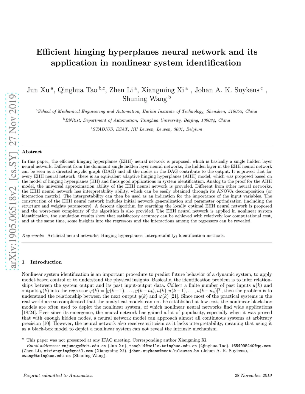 In this paper, the efficient hinging hyperplanes (EHH) neural network is proposed based on the model of hinging hyperplanes (HH). The EHH neural network is a distributed representation, the training of which involves solving several convex optimization problems and is fast. It is proved that for every EHH neural network, there is an equivalent adaptive hinging hyperplanes (AHH) tree, which was also proposed based on the model of HH and find good applications in system identification. The construction of the EHH neural network includes 2 stages. First the initial structure of the EHH neural network is randomly determined and the Lasso regression is used to choose the appropriate network. To alleviate the impact of randomness, secondly, the stacking strategy is employed to formulate a more general network structure. Different from other neural networks, the EHH neural network has interpretability ability, which can be easily obtained through its ANOVA decomposition (or interaction matrix). The interpretability can then be used as a suggestion for input variable selection. The EHH neural network is applied in nonlinear system identification, the simulation results show that the regression vector selected is reasonable and the identification speed is fast, while at the same time, the simulation accuracy is satisfactory.