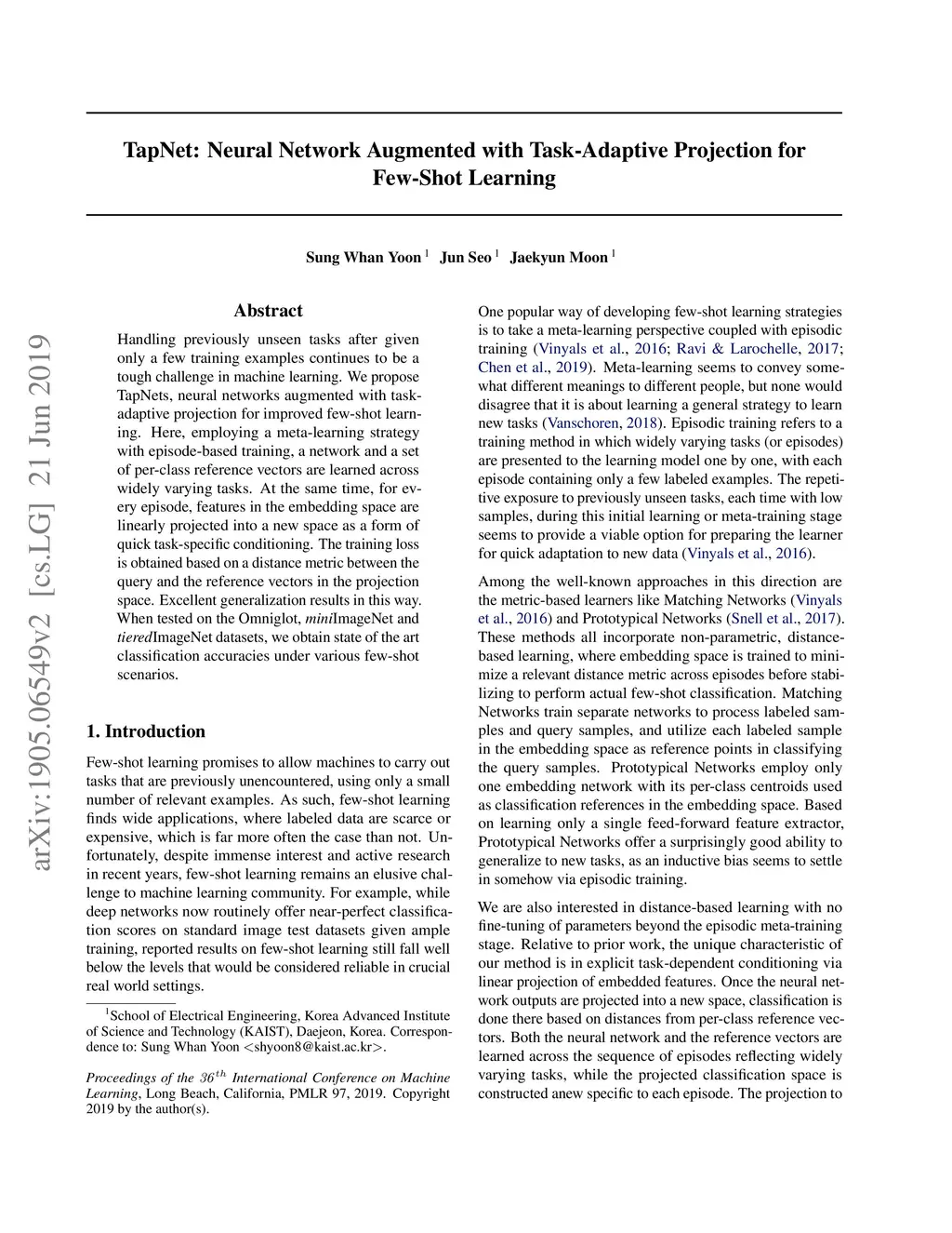 TapNet: Neural Network Augmented with Task-Adaptive Projection for