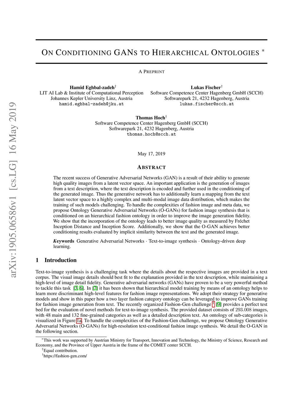 The recent success of Generative Adversarial Networks (GAN) is a result of their ability to generate high quality images from a latent vector space. An important application is the generation of images from a text description, where the text description is encoded and further used in the conditioning of the generated image. Thus the generative network has to additionally learn a mapping from the text latent vector space to a highly complex and multi-modal image data distribution, which makes the training of such models challenging. To handle the complexities of fashion image and meta data, we propose Ontology Generative Adversarial Networks (O-GANs) for fashion image synthesis that is conditioned on an hierarchical fashion ontology in order to improve the image generation fidelity. We show that the incorporation of the ontology leads to better image quality as measured by Fr\'{e}chet Inception Distance and Inception Score. Additionally, we show that the O-GAN achieves better conditioning results evaluated by implicit similarity between the text and the generated image.