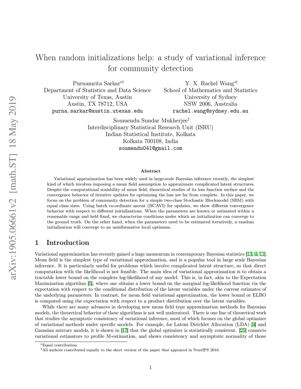 Variational approximation has been widely used in large-scale Bayesian inference recently, the simplest kind of which involves imposing a mean field assumption to approximate complicated latent structures. Despite the computational scalability of mean field, theoretical studies of its loss function surface and the convergence behavior of iterative updates for optimizing the loss are far from complete. In this paper, we focus on the problem of community detection for a simple two-class Stochastic Blockmodel (SBM) with equal class sizes. Using batch co-ordinate ascent (BCAVI) for updates, we show different convergence behavior with respect to different initializations. When the parameters are known or estimated within a reasonable range and held fixed, we characterize conditions under which an initialization can converge to the ground truth. On the other hand, when the parameters need to be estimated iteratively, a random initialization will converge to an uninformative local optimum.