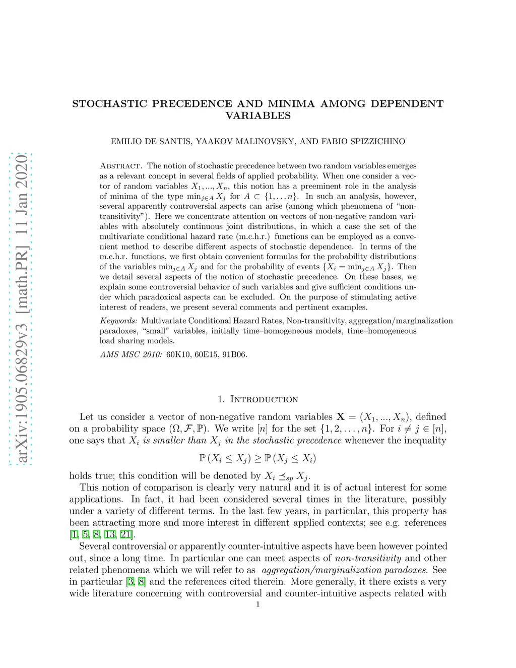 The notion of stochastic precedence between two random variables emerges as a relevant concept in several fields of applied probability. When one consider a vector of random variables , this notion has a preeminent role in the analysis of minima of the type for . In such an analysis, however, several apparently controversial aspects can arise (among which phenomena of "non-transitivity"). Here we concentrate attention on vectors of non-negative random variables with absolutely continuous joint distributions, in which a case the set of the multivariate conditional hazard rate (m.c.h.r.) functions can be employed as a convenient method to describe different aspects of stochastic dependence. In terms of the m.c.h.r. functions, we first obtain convenient formulas for the probability distributions of the variables and for the probability of events . Then we detail several aspects of the notion of stochastic precedence. On these bases, we explain some controversial behavior of such variables and give sufficient conditions under which paradoxical aspects can be excluded. On the purpose of stimulating active interest of readers, we present several comments and pertinent examples.