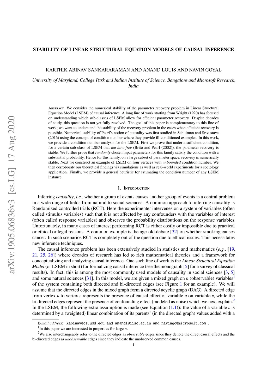 We consider the numerical stability of the parameter recovery problem in Linear Structural Equation Model () of causal inference. A long line of work starting from Wright (1920) has focused on understanding which sub-classes of allow for efficient parameter recovery. Despite decades of study, this question is not yet fully resolved. The goal of this paper is complementary to this line of work; we want to understand the stability of the recovery problem in the cases when efficient recovery is possible. Numerical stability of Pearl's notion of causality was first studied in Schulman and Srivastava (2016) using the concept of condition number where they provide ill-conditioned examples. In this work, we provide a condition number analysis for the . First we prove that under a sufficient condition, for a certain sub-class of that are \emph{bow-free} (Brito and Pearl (2002)), the parameter recovery is stable. We further prove that \emph{randomly} chosen input parameters for this family satisfy the condition with a substantial probability. Hence for this family, on a large subset of parameter space, recovery is numerically stable. Next we construct an example of on four vertices with \emph{unbounded} condition number. We then corroborate our theoretical findings via simulations as well as real-world experiments for a sociology application. Finally, we provide a general heuristic for estimating the condition number of any instance.