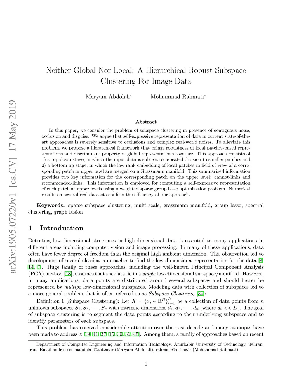 In this paper, we consider the problem of subspace clustering in presence of contiguous noise, occlusion and disguise. We argue that self-expressive representation of data in current state-of-the-art approaches is severely sensitive to occlusions and complex real-world noises. To alleviate this problem, we propose a hierarchical framework that brings robustness of local patches-based representations and discriminant property of global representations together. This approach consists of 1) a top-down stage, in which the input data is subject to repeated division to smaller patches and 2) a bottom-up stage, in which the low rank embedding of local patches in field of view of a corresponding patch in upper level are merged on a Grassmann manifold. This summarized information provides two key information for the corresponding patch on the upper level: cannot-links and recommended-links. This information is employed for computing a self-expressive representation of each patch at upper levels using a weighted sparse group lasso optimization problem. Numerical results on several real data sets confirm the efficiency of our approach.