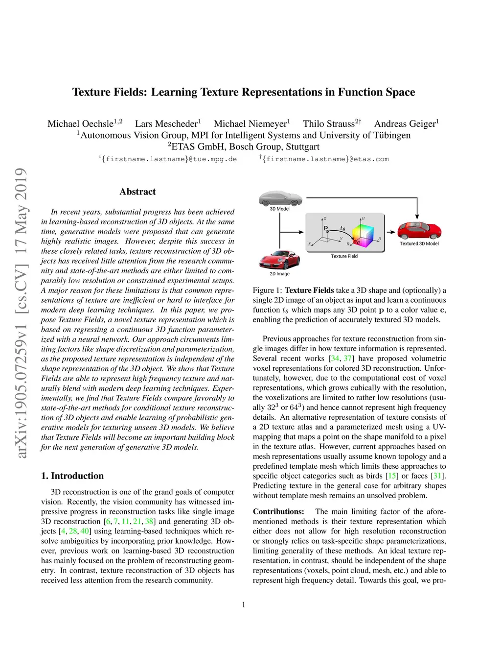 In recent years, substantial progress has been achieved in learning-based reconstruction of 3D objects. At the same time, generative models were proposed that can generate highly realistic images. However, despite this success in these closely related tasks, texture reconstruction of 3D objects has received little attention from the research community and state-of-the-art methods are either limited to comparably low resolution or constrained experimental setups. A major reason for these limitations is that common representations of texture are inefficient or hard to interface for modern deep learning techniques. In this paper, we propose Texture Fields, a novel texture representation which is based on regressing a continuous 3D function parameterized with a neural network. Our approach circumvents limiting factors like shape discretization and parameterization, as the proposed texture representation is independent of the shape representation of the 3D object. We show that Texture Fields are able to represent high frequency texture and naturally blend with modern deep learning techniques. Experimentally, we find that Texture Fields compare favorably to state-of-the-art methods for conditional texture reconstruction of 3D objects and enable learning of probabilistic generative models for texturing unseen 3D models. We believe that Texture Fields will become an important building block for the next generation of generative 3D models.
