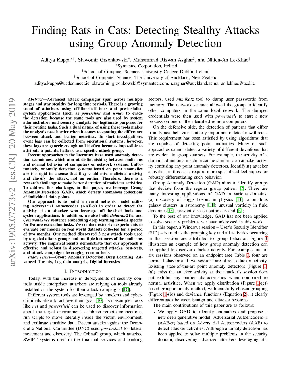 Advanced attack campaigns span across multiple stages and stay stealthy for long time periods. There is a growing trend of attackers using off-the-shelf tools and pre-installed system applications (such as \emph{powershell} and \emph{wmic}) to evade the detection because the same tools are also used by system administrators and security analysts for legitimate purposes for their routine tasks. To start investigations, event logs can be collected from operational systems; however, these logs are generic enough and it often becomes impossible to attribute a potential attack to a specific attack group. Recent approaches in the literature have used anomaly detection techniques, which aim at distinguishing between malicious and normal behavior of computers or network systems. Unfortunately, anomaly detection systems based on point anomalies are too rigid in a sense that they could miss the malicious activity and classify the attack, not an outlier. Therefore, there is a research challenge to make better detection of malicious activities. To address this challenge, in this paper, we leverage Group Anomaly Detection (GAD), which detects anomalous collections of individual data points. Our approach is to build a neural network model utilizing Adversarial Autoencoder (AAE-) in order to detect the activity of an attacker who leverages off-the-shelf tools and system applications. In addition, we also build \textit{Behavior2Vec} and \textit{Command2Vec} sentence embedding deep learning models specific for feature extraction tasks. We conduct extensive experiments to evaluate our models on real-world datasets collected for a period of two months. The empirical results demonstrate that our approach is effective and robust in discovering targeted attacks, pen-tests, and attack campaigns leveraging custom tools.