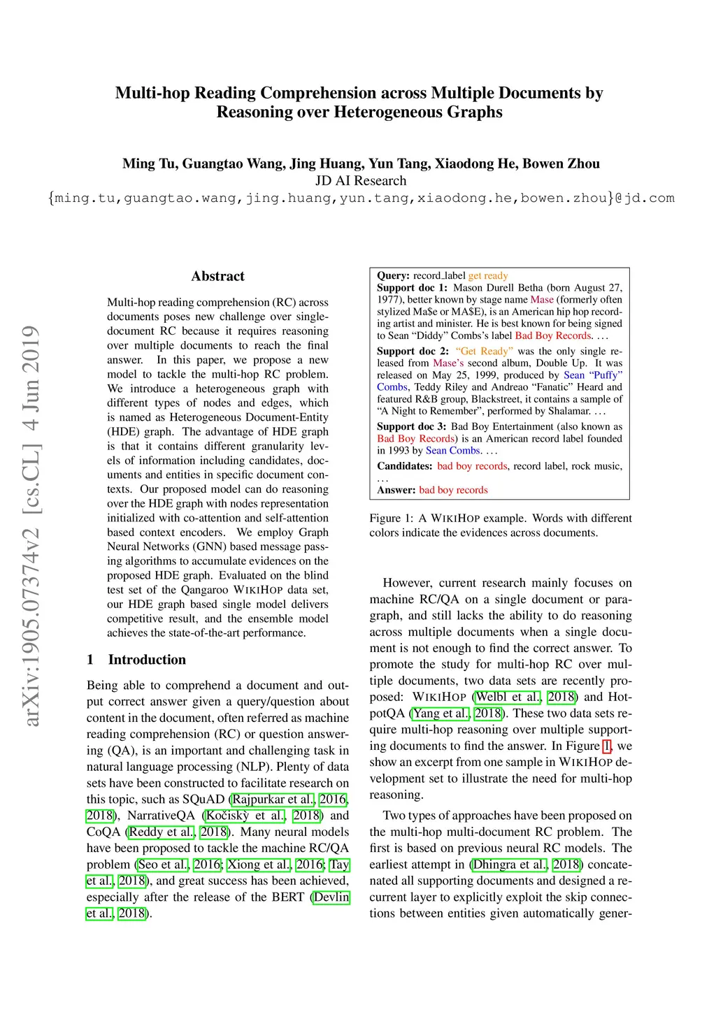 Multi-hop Reading Comprehension across Multiple Documents by Reasoning