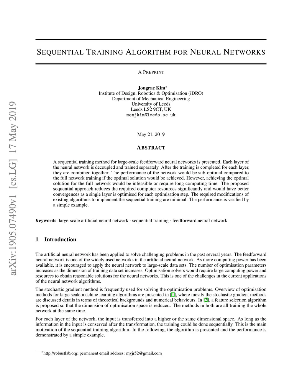 A sequential training method for large-scale feedforward neural networks is presented. Each layer of the neural network is decoupled and trained separately. After the training is completed for each layer, they are combined together. The performance of the network would be sub-optimal compared to the full network training if the optimal solution would be achieved. However, achieving the optimal solution for the full network would be infeasible or require long computing time. The proposed sequential approach reduces the required computer resources significantly and would have better convergences as a single layer is optimised for each optimisation step. The required modifications of existing algorithms to implement the sequential training are minimal. The performance is verified by a simple example.